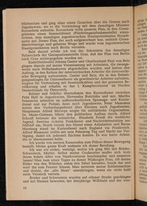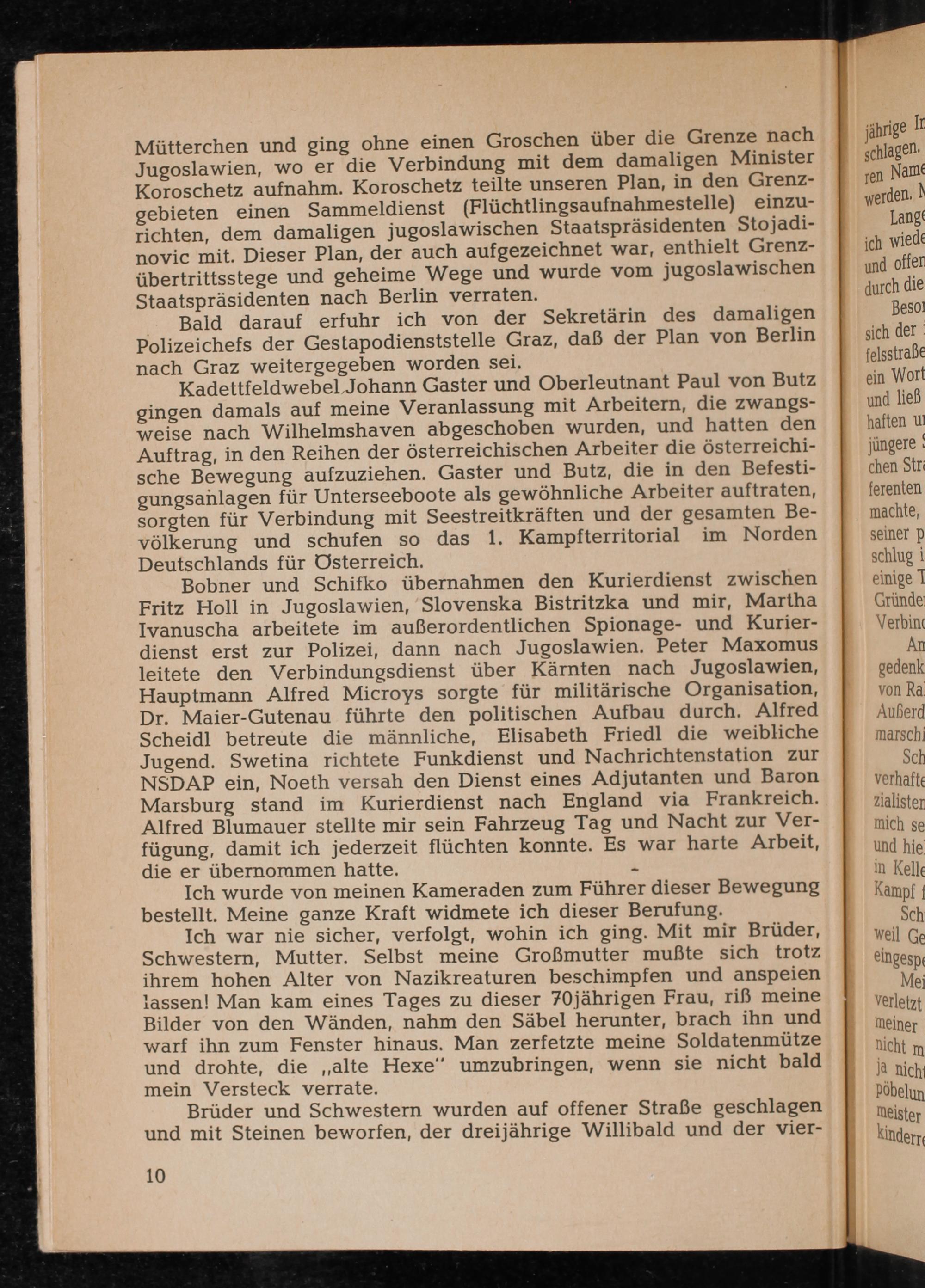 Bobner und Schifko übernahmen den Kurierdienst zwischen Fritz Holl in Jugoslawien , Slovenska Bistritzka und mir, Martha Ivanuscha arbeitete im außerordentlichen Spionage- und Kurierdienst erst zur Polizei, dann nach Jugoslawien . Peter Maxomus leitete den Verbindungsdienst über Kärnten nach Jugoslawien , Hauptmann Alfred Microys sorgte für militärische Organisation, Dr. Maier- Gutenau führte den politischen Aufbau durch. Alfred Scheidl betreute die männliche, Elisabeth Friedl die weibliche Jugend. Swetina richtete Funkdienst und Nachrichtenstation zur NSDAP ein, Noeth versah den Dienst eines Adjutanten und Baron Marsburg stand im Kurierdienst nach England via Frankreich . Alfred Blumauer stellte mir sein Fahrzeug Tag und Nacht zur Verfügung, damit ich jederzeit flüchten konnte. Es war harte Arbeit, die er übernommen hatte.