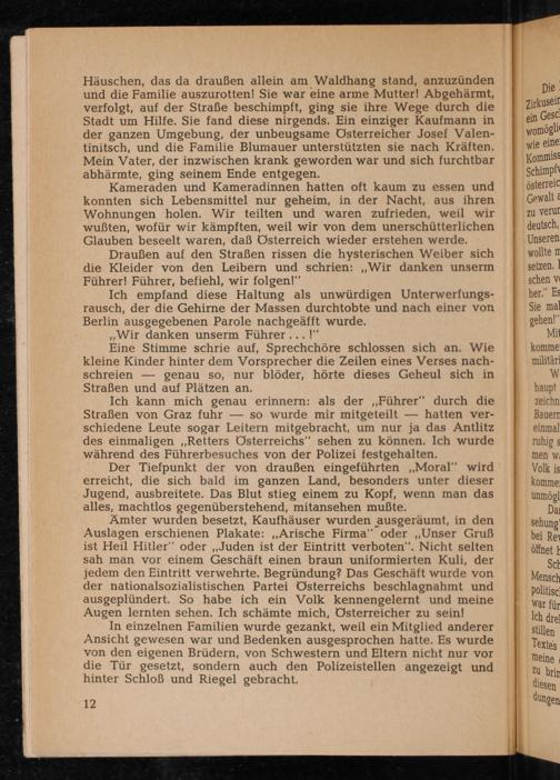 Ich kann mich genau erinnern: als der ,, Führer" durch die Straßen von Graz fuhr so wurde mir mitgeteilt hatten verschiedene Leute sogar Leitern mitgebracht, um nur ja das Antlitz des einmaligen ,, Retters Österreichs" sehen zu können. Ich wurde während des Führerbesuches von der Polizei festgehalten.