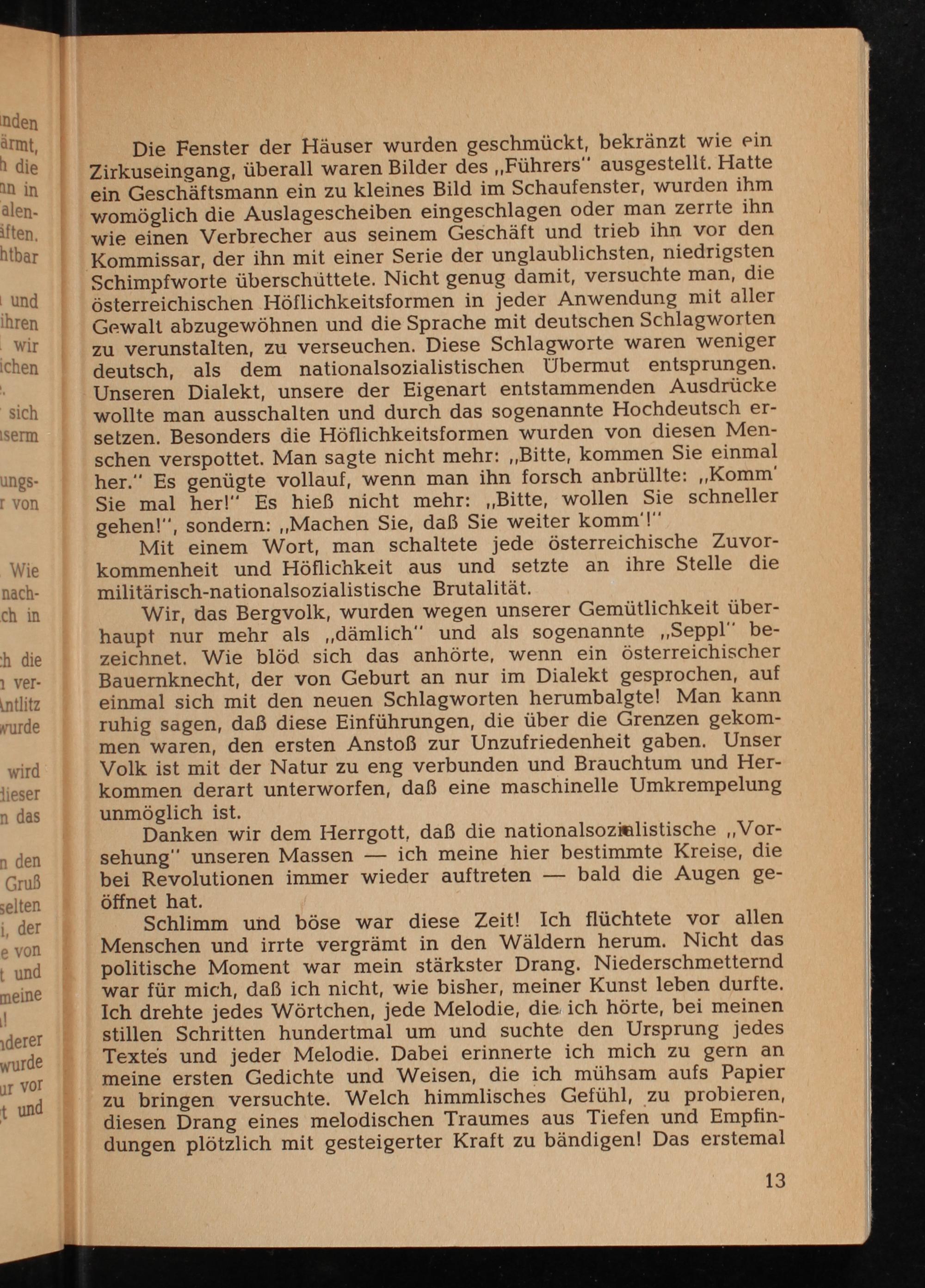Die Fenster der Häuser wurden geschmückt, bekränzt wie ein Zirkuseingang, überall waren Bilder des ,, Führers" ausgestellt. Hatte ein Geschäftsmann ein zu kleines Bild im Schaufenster, wurden ihm womöglich die Auslagescheiben eingeschlagen oder man zerrte ihn wie einen Verbrecher aus seinem Geschäft und trieb ihn vor den Kommissar, der ihn mit einer Serie der unglaublichsten, niedrigsten Schimpfworte überschüttete. Nicht genug damit, versuchte man, die österreichischen Höflichkeitsformen in jeder Anwendung mit aller Gewalt abzugewöhnen und die Sprache mit deutschen Schlagworten zu verunstalten, zu verseuchen. Diese Schlagworte waren weniger deutsch , als dem nationalsozialistischen Übermut entsprungen. Unseren Dialekt, unsere der Eigenart entstammenden Ausdrücke wollte man ausschalten und durch das sogenannte Hochdeutsch ersetzen. Besonders die Höflichkeitsformen wurden von diesen Menschen verspottet. Man sagte nicht mehr: ,, Bitte, kommen Sie einmal her." Es genügte vollauf, wenn man ihn forsch anbrüllte: ,, Komm' Sie mal her!" Es hieß nicht mehr: ,, Bitte, wollen Sie schneller gehen!", sondern: ,, Machen Sie, daß Sie weiter komm'!"