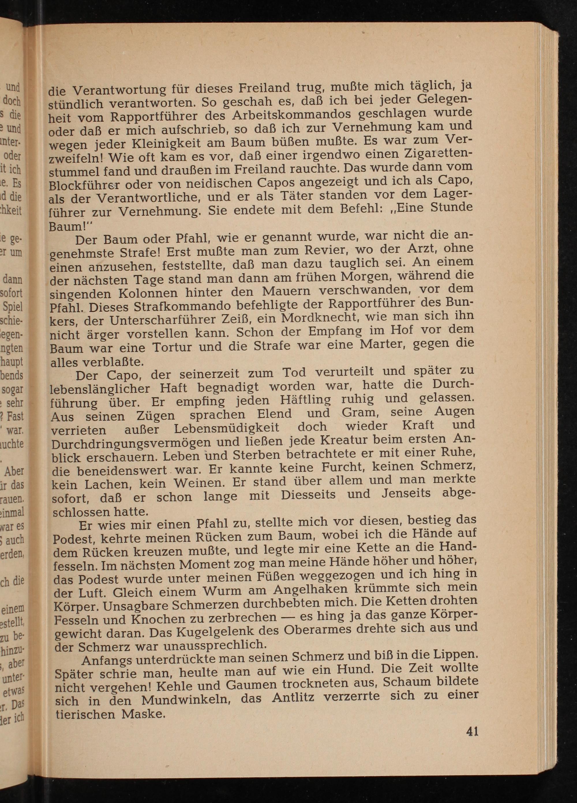 singenden Kolonnen hinter den Mauern verschwanden, vor dem Pfahl. Dieses Strafkommando befehligte der Rapportführer des Bun- kers, der Unterscharführer Zeiß, ein Mordknecht, wie man sich ihn nicht ärger vorstellen kann. Schon der Empfang im Hof vor dem Baum war eine Tortur und die Strafe war eine Marter, gegen die alles verblaßte.