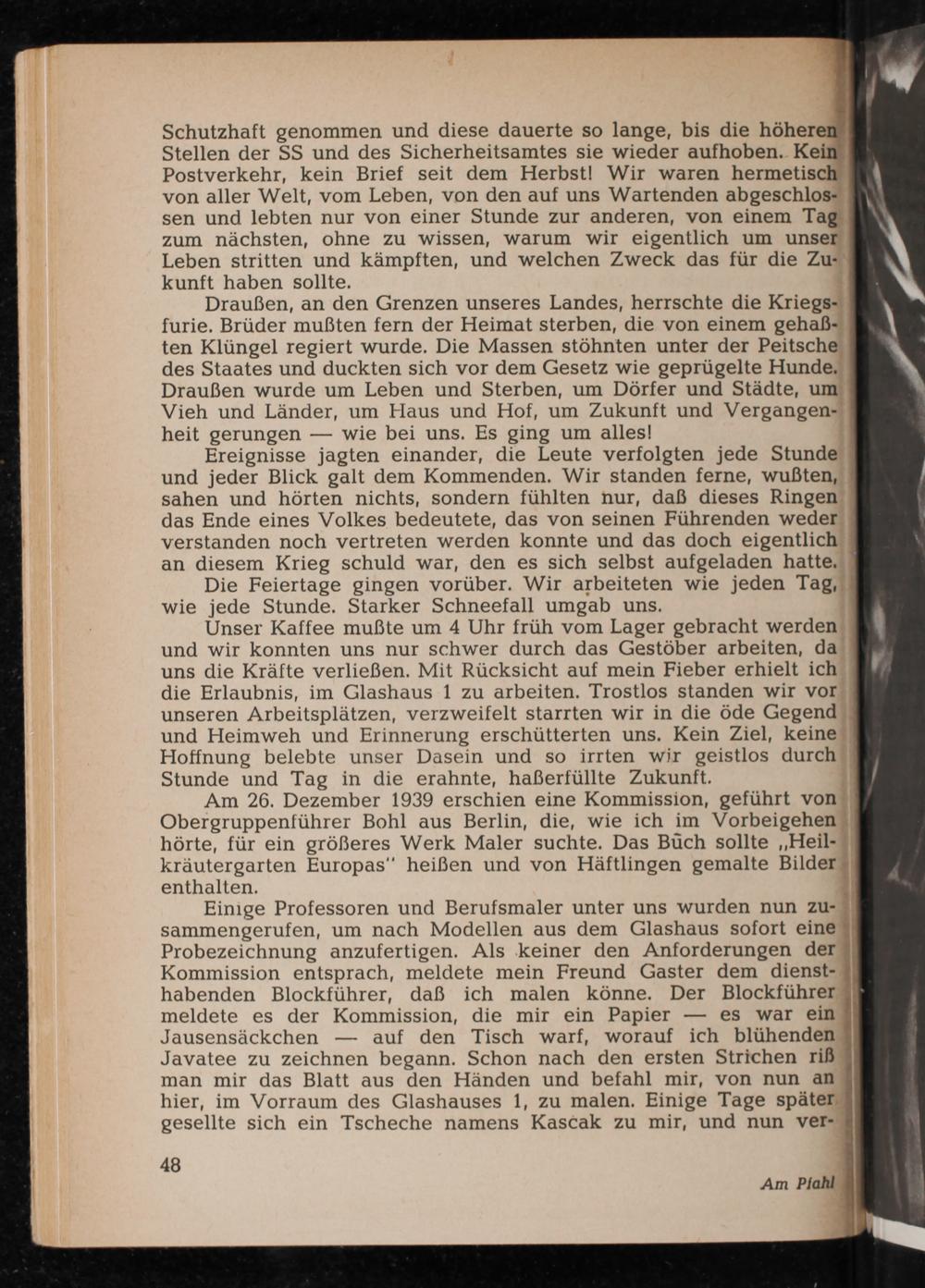 Am 26. Dezember 1939 erschien eine Kommission, geführt von Obergruppenführer Bohl aus Berlin , die, wie ich im Vorbeigehen hörte, für ein größeres Werk Maler suchte. Das Buch sollte ,, Heilkräutergarten Europas" heißen und von Häftlingen gemalte Bilder enthalten.