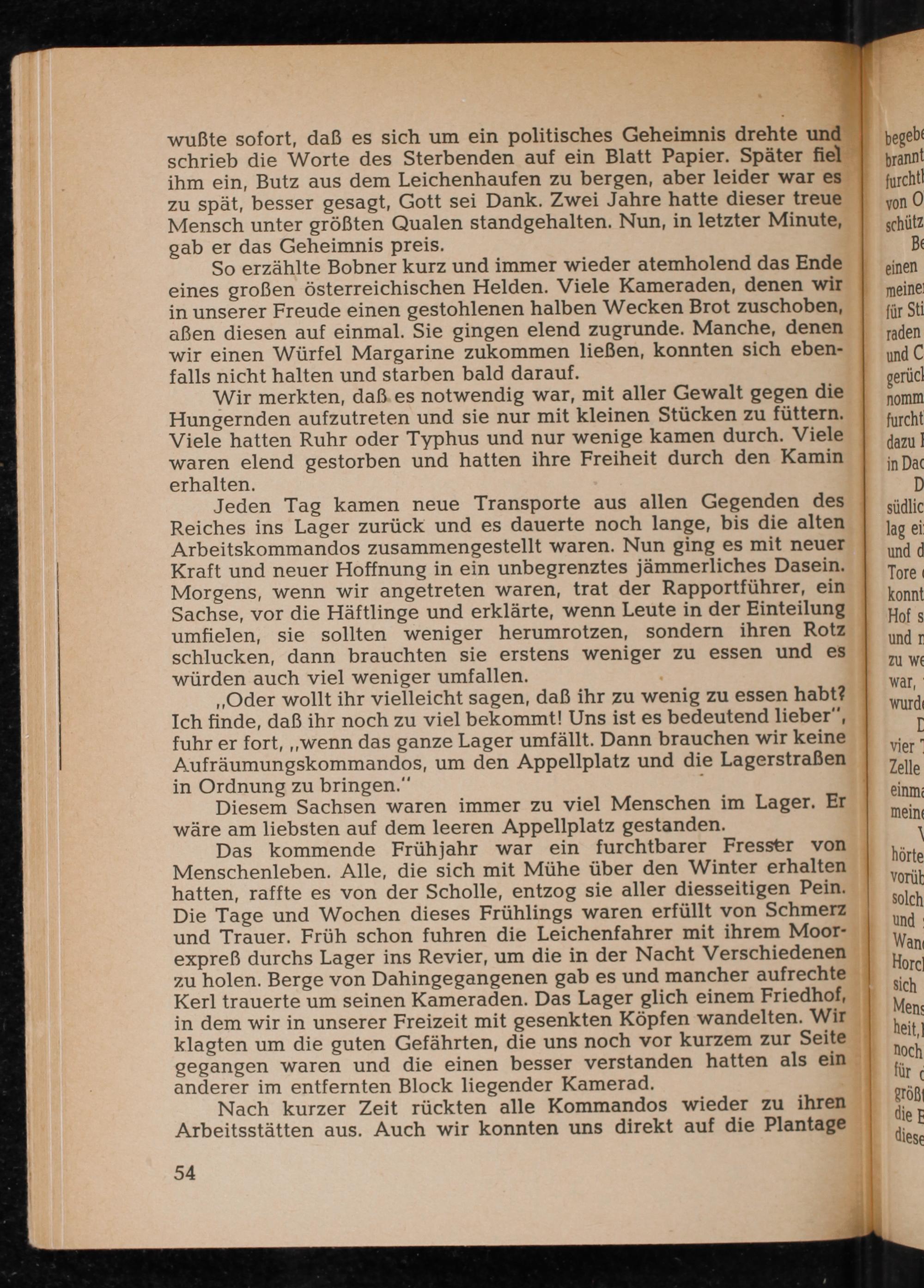 Mensch unter größten Qualen standgehalten. Nun, in letzter Minute, gab er das Geheimnis preis. a So erzählte Bobner kurz und immer wieder atemholend das Ende| eines großen österreichischen Helden. Viele Kameraden, denen wir in unserer Freude einen gestohlenen halben Wecken Brot zuschoben, aßen diesen auf einmal. Sie gingen elend zugrunde. Manche, denen| wir einen Würfel Margarine zukommen ließen, konnten sich eben- falls nicht halten und starben bald darauf.