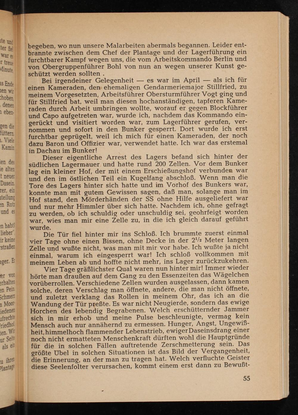 Bei irgendeiner Gelegenheit es war im April als ich für einen Kameraden, den ehemaligen Gendarmeriemajor Stillfried, zu meinem Vorgesetzten, Arbeitsführer Obersturmführer Vogt ging und für Stillfried bat, weil man diesen hochanständigen, tapferen Kameraden durch Arbeit umbringen wollte, worauf er gegen Blockführer und Capo aufgetreten war, wurde ich, nachdem das Kommando eingerückt und visitiert worden war, zum Lagerführer gerufen, vernommen und sofort in den Bunker gesperrt. Dort wurde ich erst furchtbar geprügelt, weil ich mich für einen Kameraden, der noch dazu Baron und Offizier war, verwendet hatte. Ich war das erstemal in Dachau im Bunker!