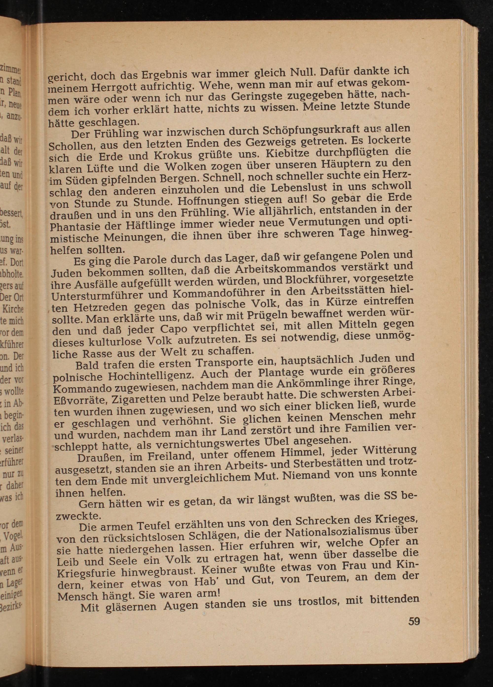 Der Frühling war inzwischen durch Schöpfungsurkraft aus allen Schollen, aus den letzten Enden des Gezweigs getreten. Es lockerte sich die Erde und Krokus grüßte uns. Kiebitze durchpflügten die klaren Lüfte und die Wolken zogen über unseren Häuptern zu den im Süden gipfelnden Bergen. Schnell, noch schneller suchte ein Herzschlag den anderen einzuholen und die Lebenslust in uns schwoll von Stunde zu Stunde. Hoffnungen stiegen auf! So gebar die Erde draußen und in uns den Frühling. Wie alljährlich, entstanden in der Phantasie der Häftlinge immer wieder neue Vermutungen und optimistische Meinungen, die ihnen über ihre schweren Tage hinweghelfen sollten.