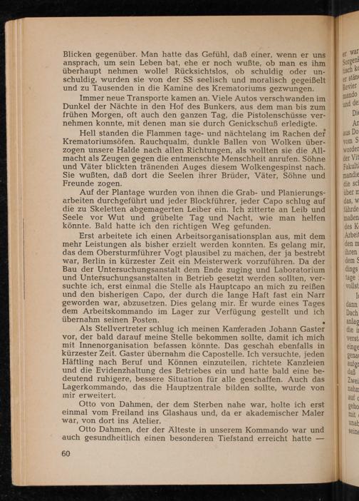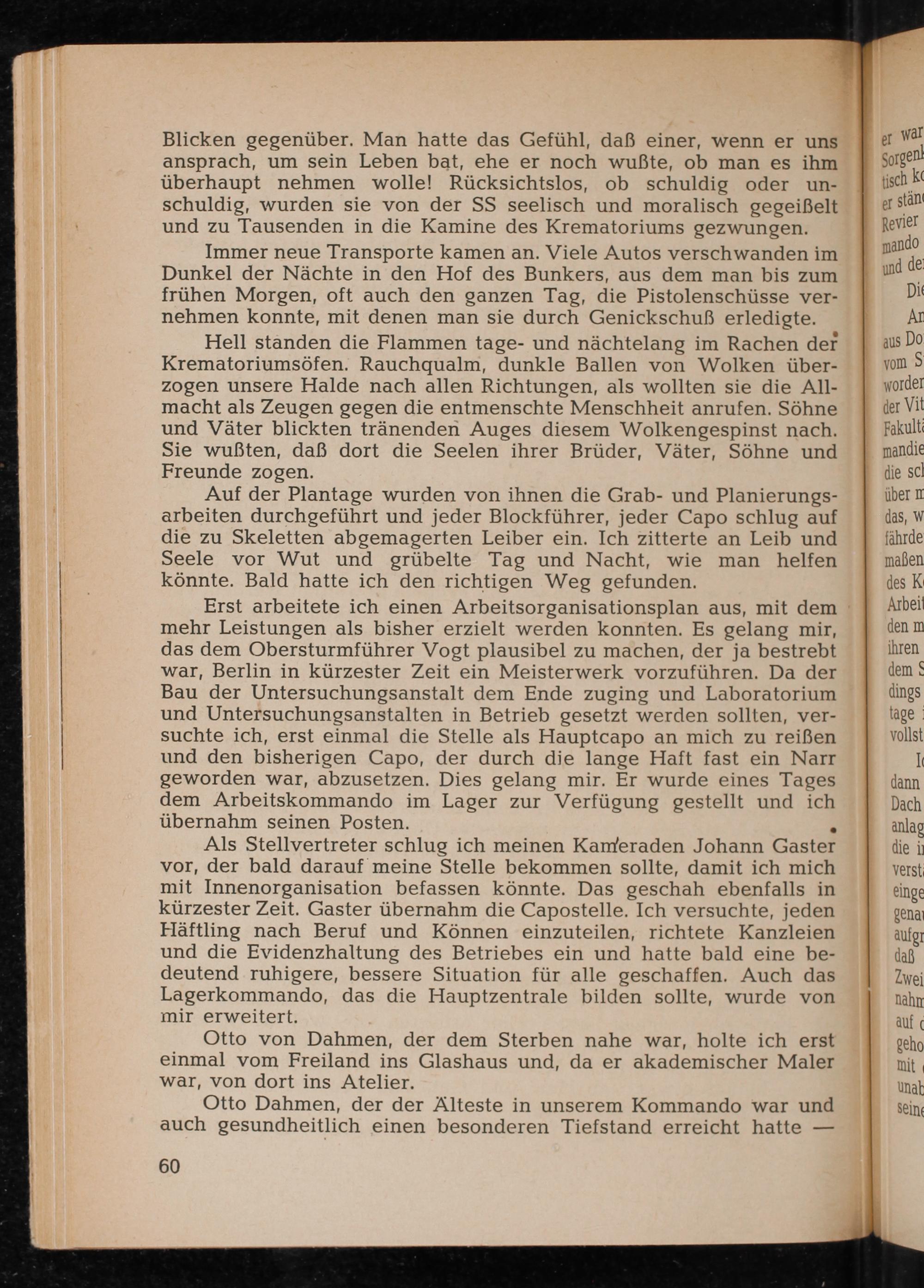 Als Stellvertreter schlug ich meinen Kameraden Johann Gaster vor, der bald darauf meine Stelle bekommen sollte, damit ich mich mit Innenorganisation befassen könnte. Das geschah ebenfalls in kürzester Zeit. Gaster übernahm die Capostelle. Ich versuchte, jeden Häftling nach Beruf und Können einzuteilen, richtete Kanzleien und die Evidenzhaltung des Betriebes ein und hatte bald eine bedeutend ruhigere, bessere Situation für alle geschaffen. Auch das Lagerkommando, das die Hauptzentrale bilden sollte, wurde von mir erweitert.