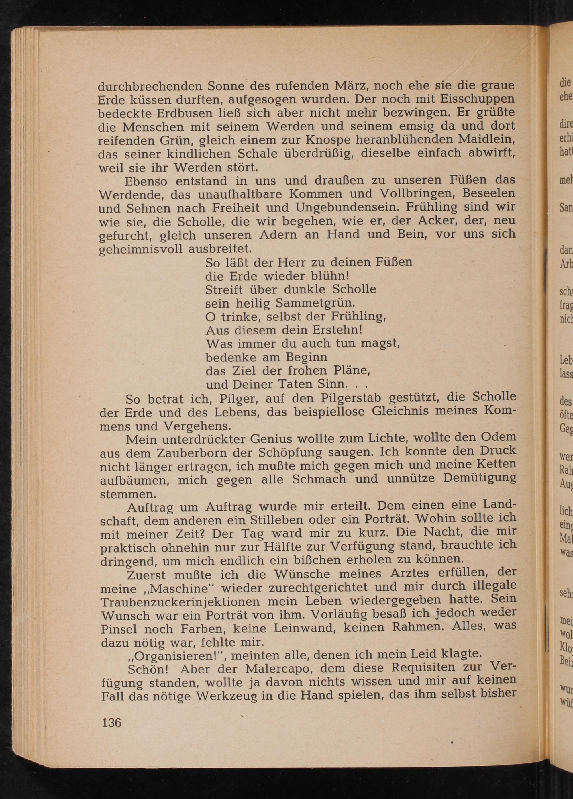 Ebenso entstand in uns und draußen zu unseren Füßen das Werdende, das unaufhaltbare Kommen und Vollbringen, Beseelen und Sehnen nach Freiheit und Ungebundensein. Frühling sind wir wie sie, die Scholle, die wir begehen, wie er, der Acker, der, neu gefurcht, gleich unseren Adern an Hand und Bein, vor uns sich geheimnisvoll ausbreitet.