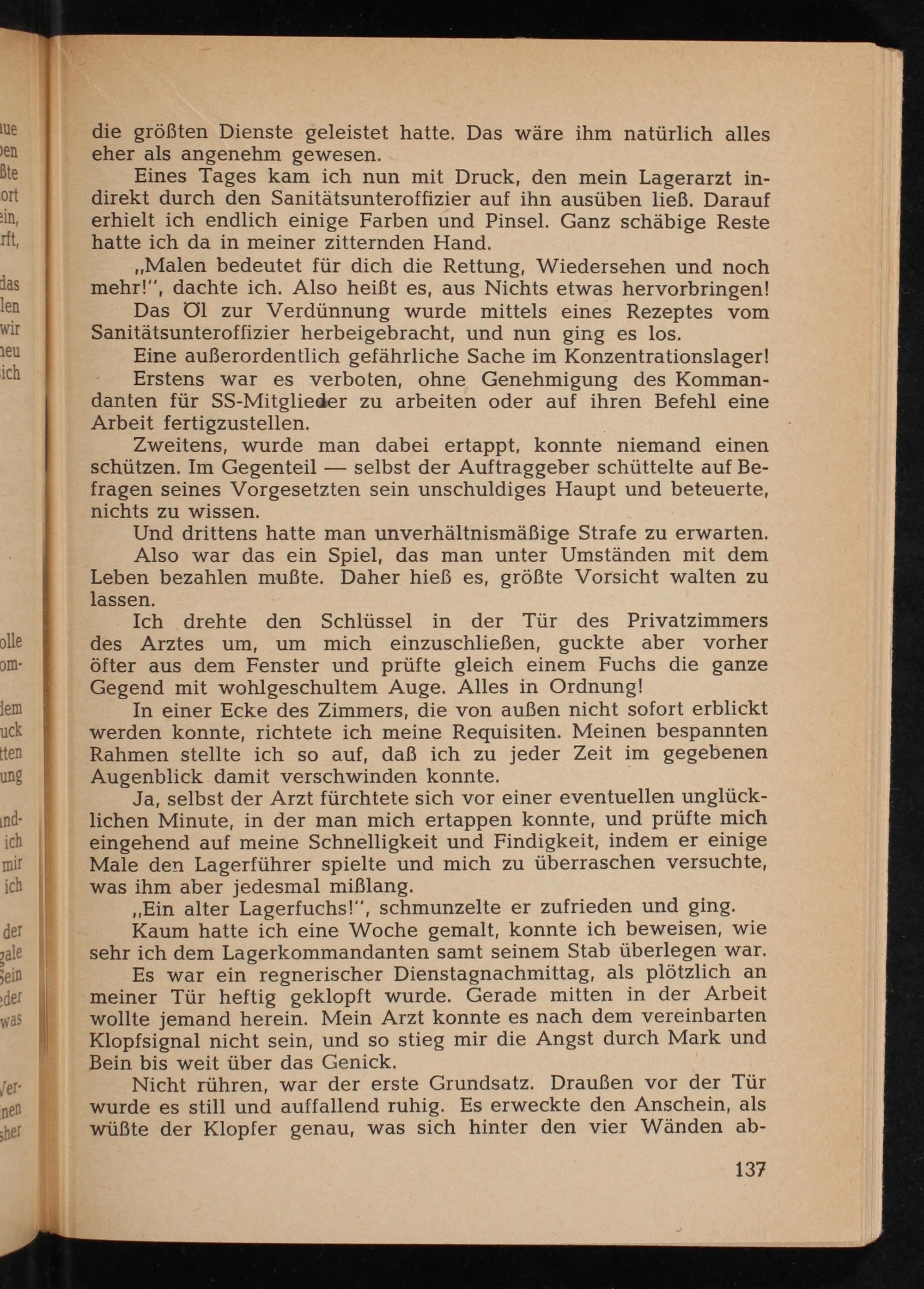 Ja, selbst der Arzt fürchtete sich vor einer eventuellen unglück- lichen Minute, in der man mich ertappen konnte, und prüfte mich eingehend auf meine Schnelligkeit und Findigkeit, indem er einige Male den Lagerführer spielte und mich zu überraschen versuchte, was ihm aber jedesmal mißlang.