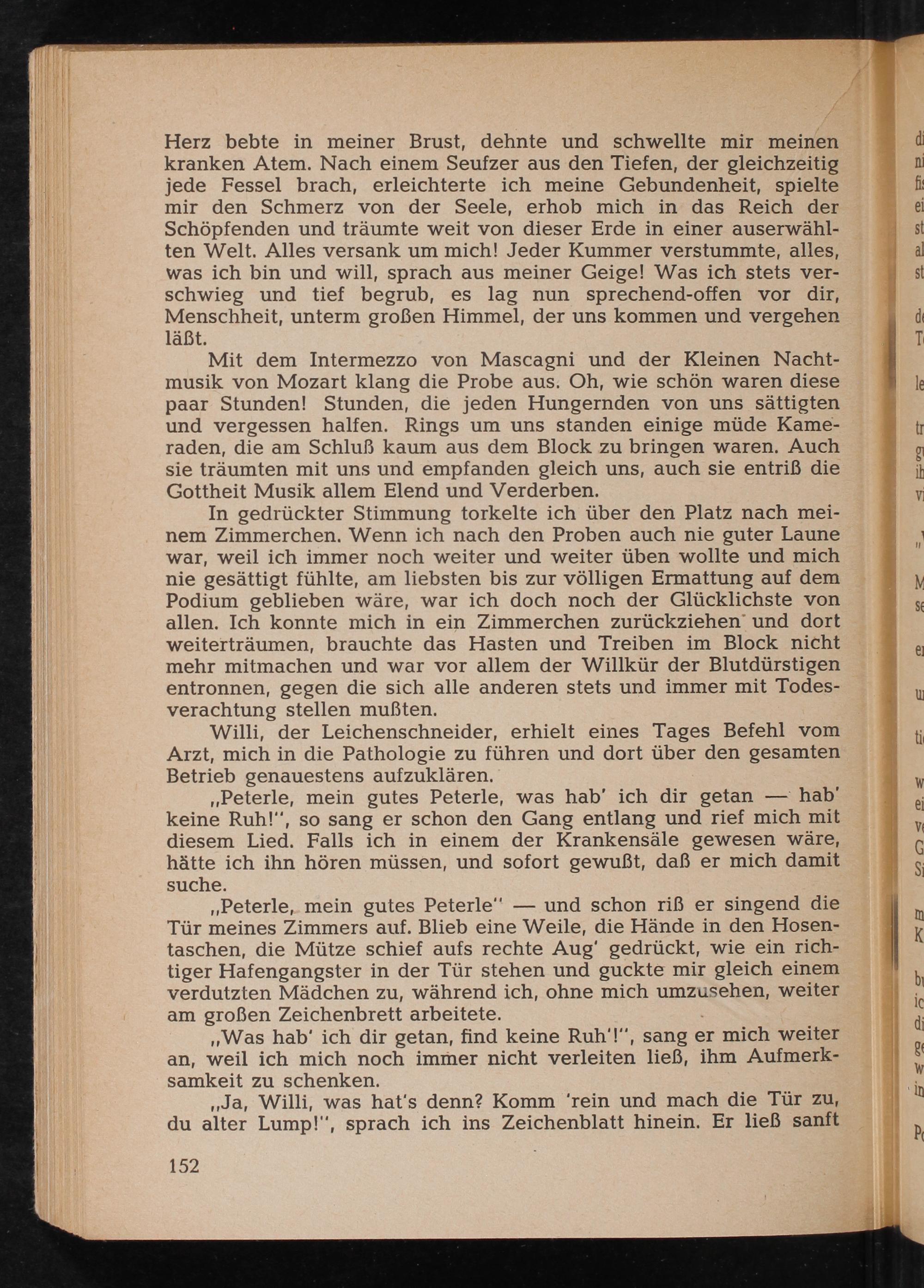 Mit dem Intermezzo von Mascagni und der Kleinen Nacht- musik von Mozart klang die Probe aus. Oh, wie schön waren diese paar Stunden! Stunden, die jeden Hungernden von uns sättigten und vergessen halfen. Rings um uns standen einige müde Kame- raden, die am Schluß kaum aus dem Block zu bringen waren. Auch sie träumten mit uns und empfanden gleich uns, auch sie entriß die Gottheit Musik allem Elend und Verderben.