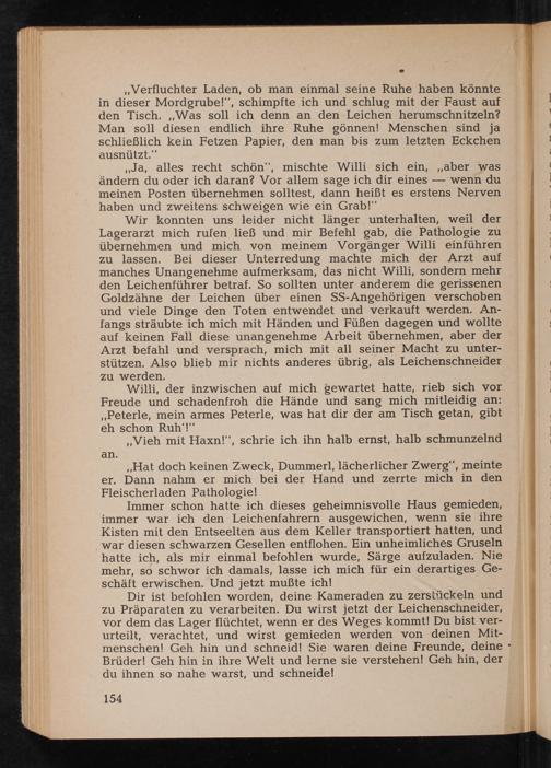 Wir konnten uns leider nicht länger unterhalten, weil der Lagerarzt mich rufen ließ und mir Befehl gab, die Pathologie zu übernehmen und mich von meinem Vorgänger Willi einführen zu lassen. Bei dieser Unterredung machte mich der Arzt auf manches Unangenehme aufmerksam, das nicht Willi, sondern mehr den Leichenführer betraf. So sollten unter anderem die gerissenen Goldzähne der Leichen über einen SS- Angehörigen verschoben und viele Dinge den Toten entwendet und verkauft werden. Anfangs sträubte ich mich mit Händen und Füßen dagegen und wollte auf keinen Fall diese unangenehme Arbeit übernehmen, aber der Arzt befahl und versprach, mich mit all seiner Macht zu unterstützen. Also blieb mir nichts anderes übrig, als Leichenschneider zu werden.
