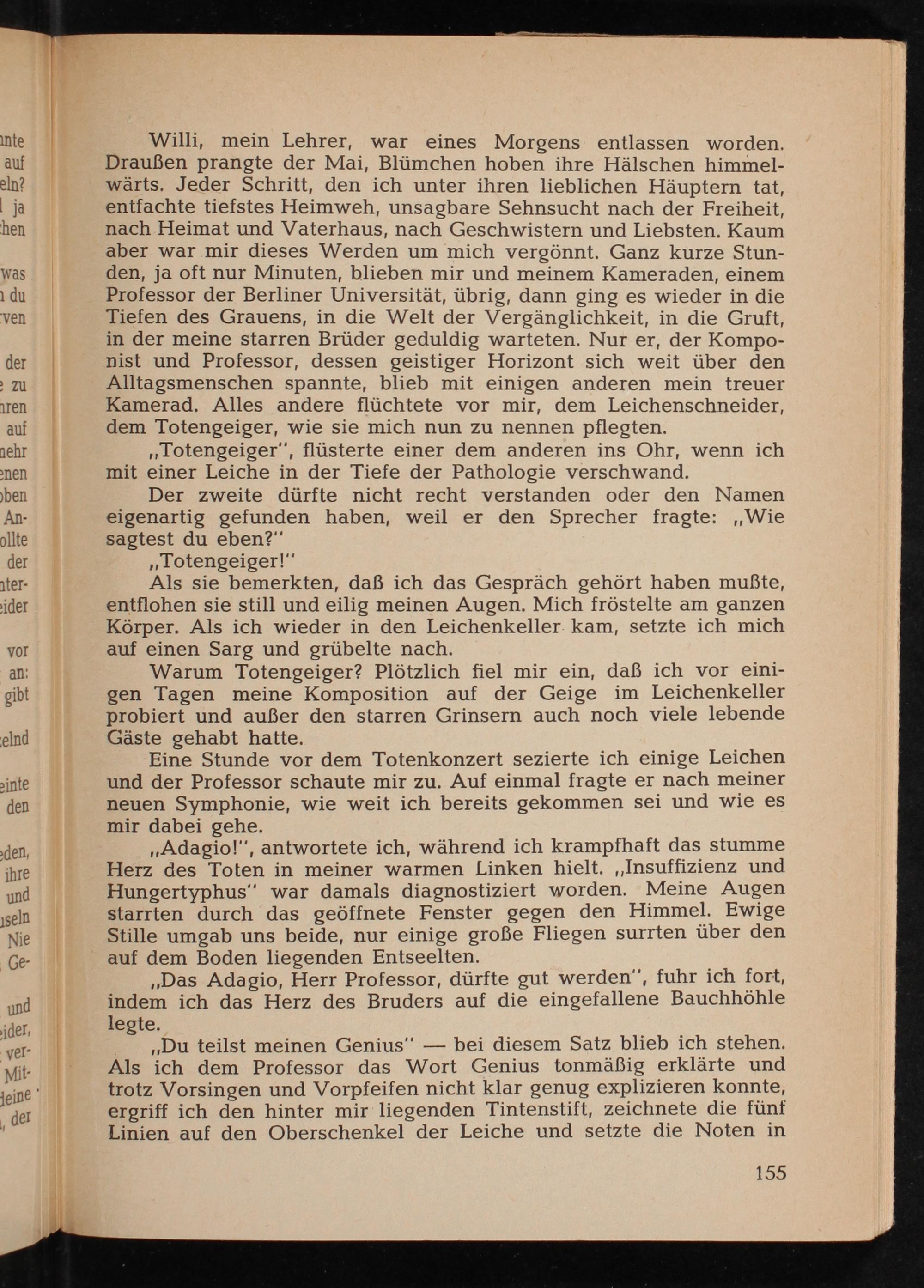 Willi, mein Lehrer, war eines Morgens entlassen worden. Draußen prangte der Mai, Blümchen hoben ihre Hälschen himmel- wärts. Jeder Schritt, den ich unter ihren lieblichen Häuptern tat, entfachte tiefstes Heimweh, unsagbare Sehnsucht nach der Freiheit, nach Heimat und Vaterhaus, nach Geschwistern und Liebsten. Kaum aber war mir dieses Werden um mich vergönnt. Ganz kurze Stun- den, ja oft nur Minuten, blieben mir und meinem Kameraden, einem Professor der Berliner Universität, übrig, dann ging es wieder in die Tiefen des Grauens, in die Welt der Vergänglichkeit, in die Gruft, in der meine starren Brüder geduldig warteten. Nur er, der Kompo- nist und Professor, dessen geistiger Horizont sich weit über den Alltagsmenschen spannte, blieb mit einigen anderen mein treuer Kamerad. Alles andere flüchtete vor mir, dem Leichenschneider, dem Totengeiger, wie sie mich nun zu nennen pflegten.