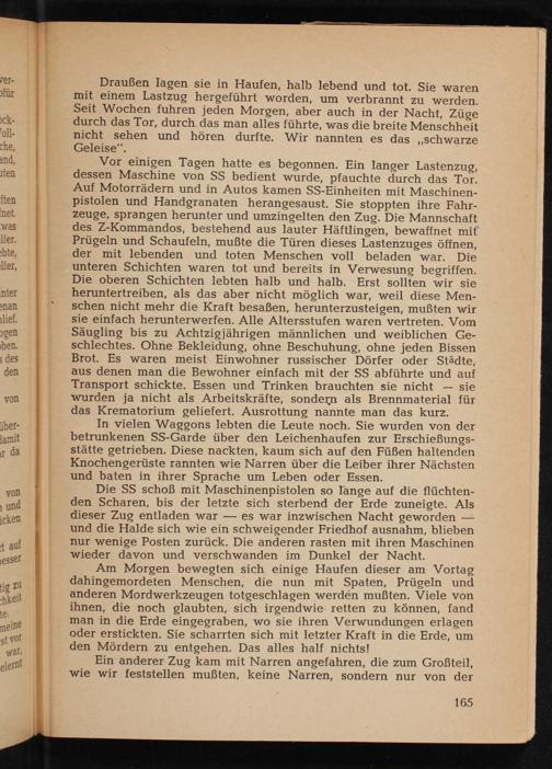 Vor einigen Tagen hatte es begonnen. Ein langer Lastenzug, dessen Maschine von SS bedient wurde, pfauchte durch das Tor. Auf Motorrädern und in Autos kamen SS - Einheiten mit Maschinenpistolen und Handgranaten herangesaust. Sie stoppten ihre Fahrzeuge, sprangen herunter und umzingelten den Zug. Die Mannschaft des Z- Kommandos, bestehend aus lauter Häftlingen, bewaffnet mif Prügeln und Schaufeln, mußte die Türen dieses Lastenzuges öffnen, der mit lebenden und toten Menschen voll beladen war. Die unteren Schichten waren tot und bereits in Verwesung begriffen. Die oberen Schichten lebten halb und halb. Erst sollten wir sie heruntertreiben, als das aber nicht möglich war, weil diese Menschen nicht mehr die Kraft besaßen, herunterzusteigen, mußten wir sie einfach herunterwerfen. Alle Altersstufen waren vertreten. Vom Säugling bis zu Achtzigjährigen männlichen und weiblichen Geschlechtes. Ohne Bekleidung, ohne Beschuhung, ohne jeden Bissen Brot. Es waren meist Einwohner russischer Dörfer oder Städte, aus denen man die Bewohner einfach mit der SS abführte und auf Transport schickte. Essen und Trinken brauchten sie nicht sie wurden ja nicht als Arbeitskräfte, sondern als Brennmaterial für das Krematorium geliefert. Ausrottung nannte man das kurz.