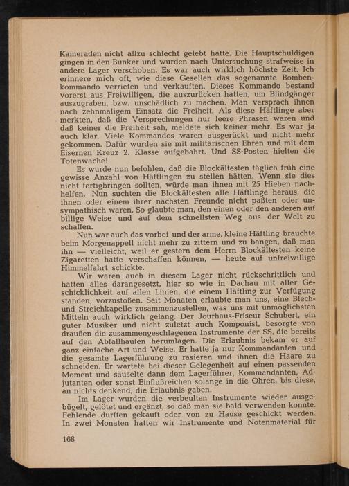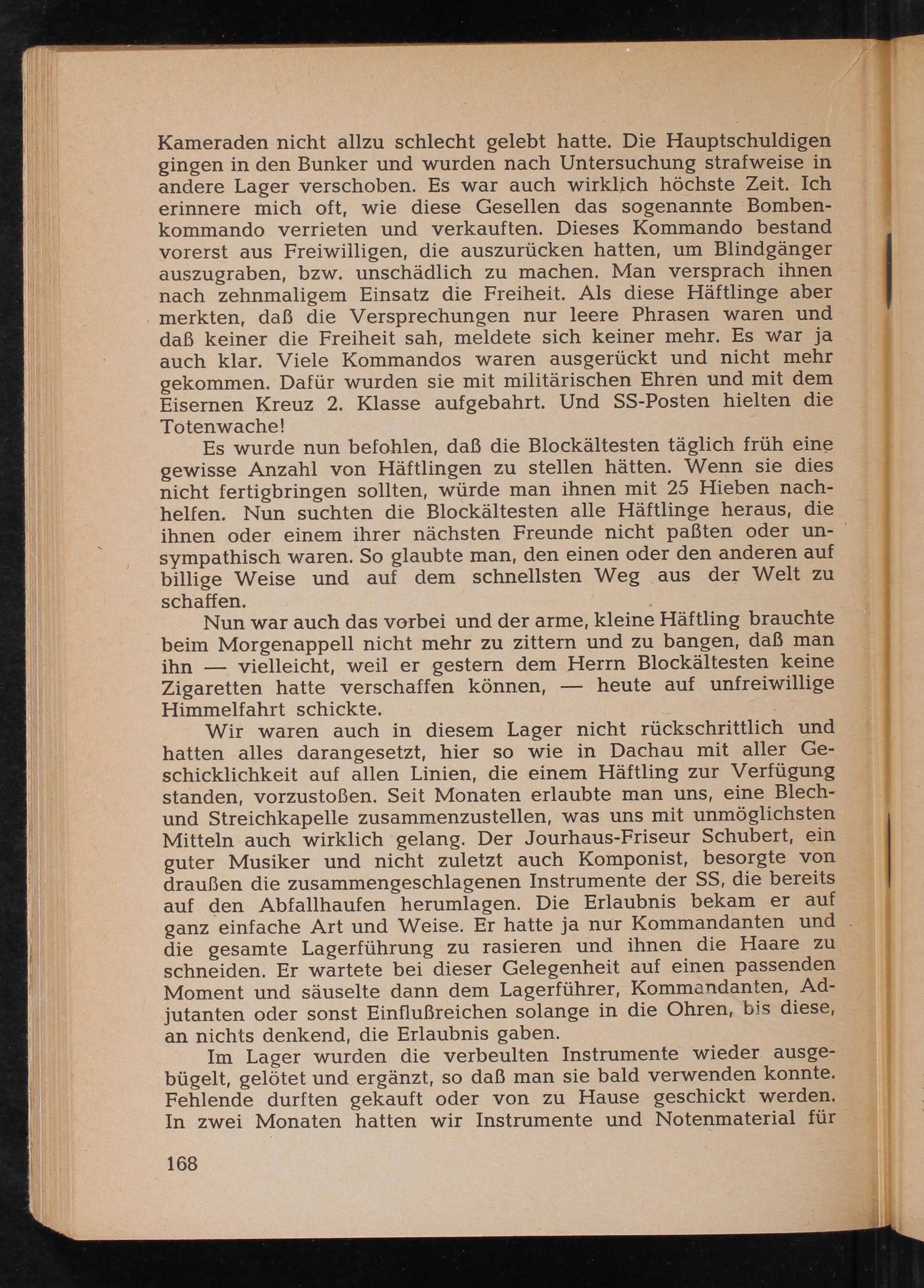 Wir waren auch in diesem Lager nicht rückschrittlich und hatten alles darangesetzt, hier so wie in Dachau mit aller Geschicklichkeit auf allen Linien, die einem Häftling zur Verfügung standen, vorzustoßen. Seit Monaten erlaubte man uns, eine Blechund Streichkapelle zusammenzustellen, was uns mit unmöglichsten Mitteln auch wirklich gelang. Der Jourhaus- Friseur Schubert, ein guter Musiker und nicht zuletzt auch Komponist, besorgte von draußen die zusammengeschlagenen Instrumente der SS, die bereits auf den Abfallhaufen herumlagen. Die Erlaubnis bekam er auf ganz einfache Art und Weise. Er hatte ja nur Kommandanten und die gesamte Lagerführung zu rasieren und ihnen die Haare zu schneiden. Er wartete bei dieser Gelegenheit auf einen passenden Moment und säuselte dann dem Lagerführer, Kommandanten, Adjutanten oder sonst Einflußreichen solange in die Ohren, bis diese, an nichts denkend, die Erlaubnis gaben.
