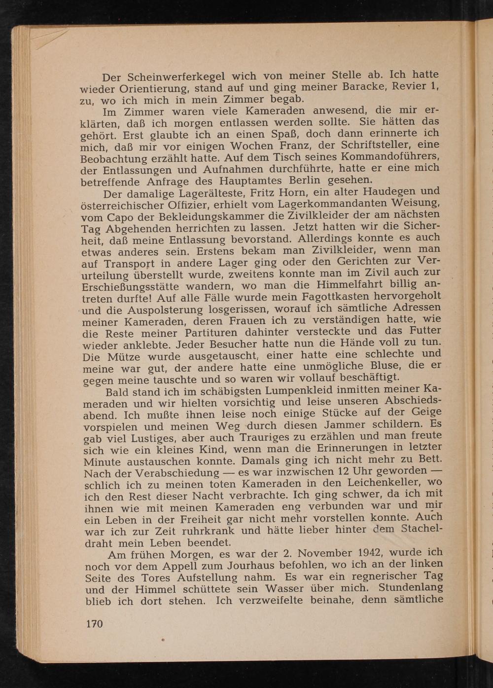 Bald stand ich im schäbigsten Lumpenkleid inmitten meiner Kameraden und wir hielten vorsichtig und leise unseren Abschiedsabend. Ich mußte ihnen leise noch einige Stücke auf der Geige vorspielen und meinen Weg durch diesen Jammer schildern. Es gab viel Lustiges, aber auch Trauriges zu erzählen und man freute sich wie ein kleines Kind, wenn man die Erinnerungen in letzter Minute austauschen konnte. Damals ging ich nicht mehr zu Bett. Nach der Verabschiedung- es war inzwischen 12 Uhr geworden- schlich ich zu meinen toten Kameraden in den Leichenkeller, wo ich den Rest dieser Nacht verbrachte. Ich ging schwer, da ich mit ihnen wie mit meinen Kameraden eng verbunden war und mir ein Leben in der Freiheit gar nicht mehr vorstellen konnte. Auch war ich zur Zeit ruhrkrank und hätte lieber hinter dem Stacheldraht mein Leben beendet.