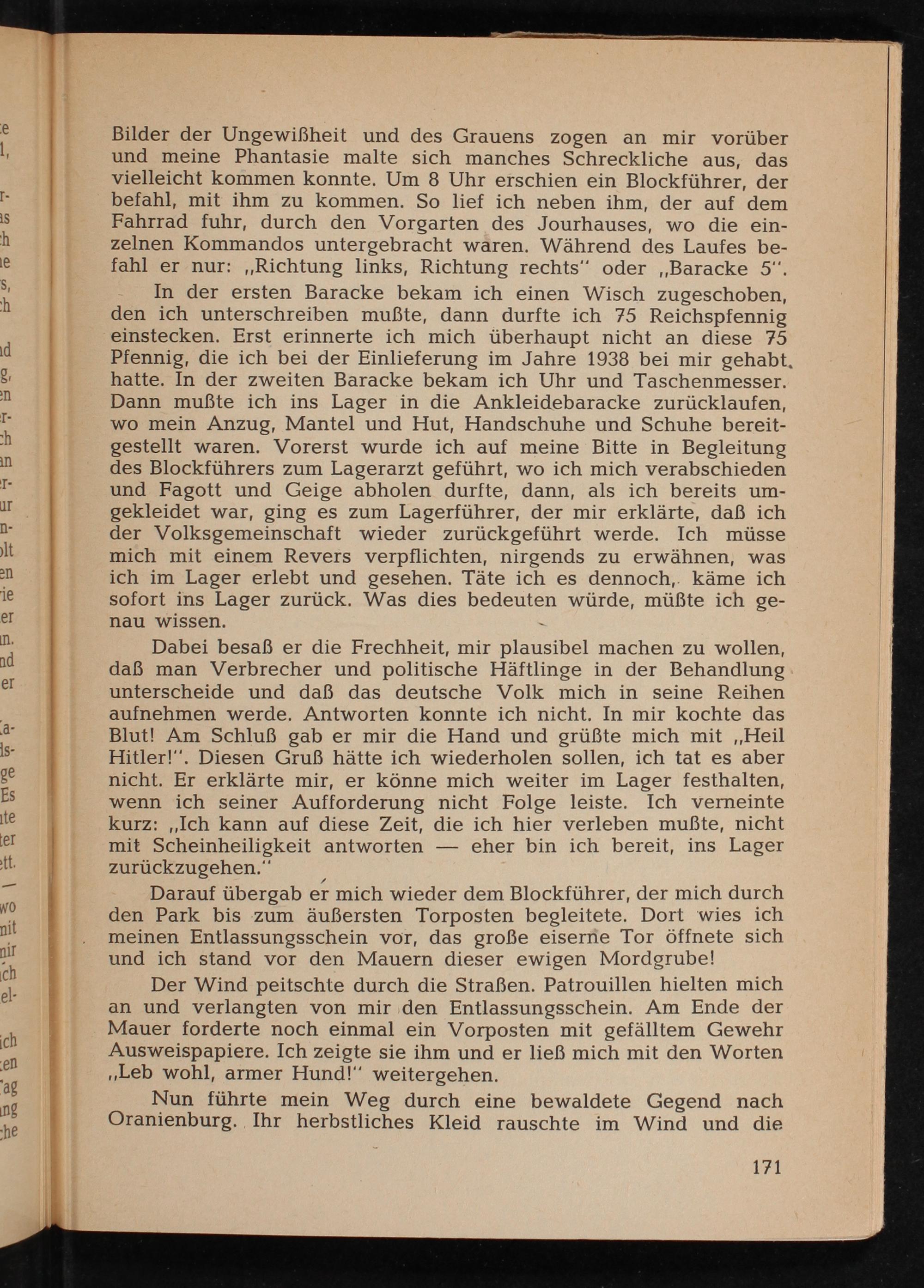 In der ersten Baracke bekam ich einen Wisch zugeschoben, den ich unterschreiben mußte, dann durfte ich 75 Reichspfennig einstecken. Erst erinnerte ich mich überhaupt nicht an diese 75 Pfennig, die ich bei der Einlieferung im Jahre 1938 bei mir gehabt, hatte. In der zweiten Baracke bekam ich Uhr und Taschenmesser. Dann mußte ich ins Lager in die Ankleidebaracke zurücklaufen, wo mein Anzug, Mantel und Hut, Handschuhe und Schuhe bereit- gestellt waren. Vorerst wurde ich auf meine Bitte in Begleitung des Blockführers zum Lagerarzt geführt, wo ich mich verabschieden und Fagott und Geige abholen durfte, dann, als ich bereits um- gekleidet war, ging es zum Lagerführer, der mir erklärte, daß ich der Volksgemeinschaft wieder zurückgeführt werde. Ich müsse mich mit einem Revers verpflichten, nirgends zu erwähnen, was ich im Lager erlebt und gesehen. Täte ich es dennoch,. käme ich sofort ins Lager zurück. Was dies bedeuten würde, müßte ich ge- nau wissen.