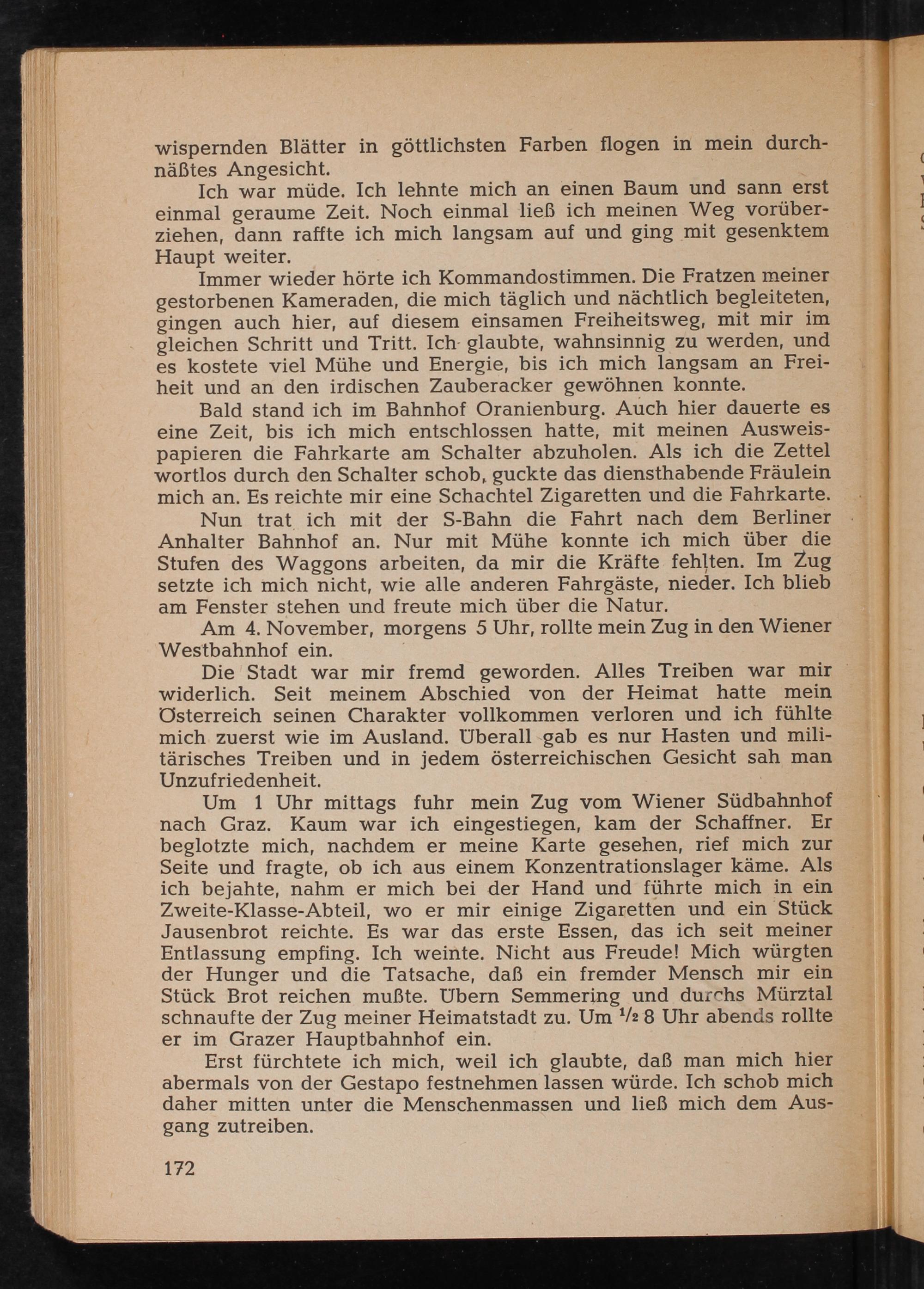 Um 1 Uhr mittags fuhr mein Zug vom Wiener Südbahnhof nach Graz . Kaum war ich eingestiegen, kam der Schaffner. Er beglotzte mich, nachdem er meine Karte gesehen, rief mich zur Seite und fragte, ob ich aus einem Konzentrationslager käme. Als ich bejahte, nahm er mich bei der Hand und führte mich in ein Zweite- Klasse- Abteil, wo er mir einige Zigaretten und ein Stück Jausenbrot reichte. Es war das erste Essen, das ich seit meiner Entlassung empfing. Ich weinte. Nicht aus Freude! Mich würgten der Hunger und die Tatsache, daß ein fremder Mensch mir ein Stück Brot reichen mußte. Übern Semmering und durchs Mürztal schnaufte der Zug meiner Heimatstadt zu. Um 12 8 Uhr abends rollte er im Grazer Hauptbahnhof ein.