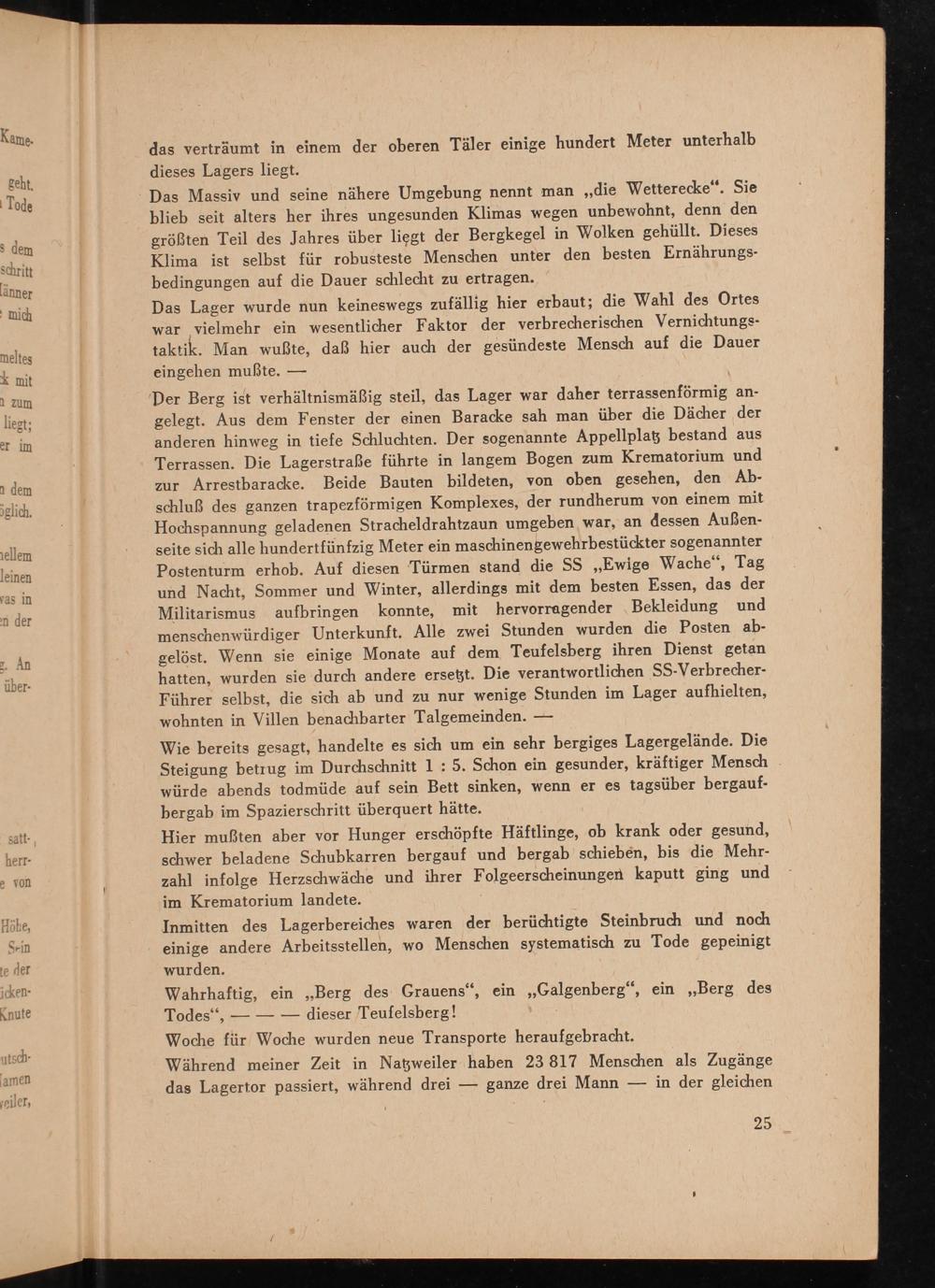 gelegt. Aus dem Fenster der einen Baracke sah man über die Dächer der anderen hinweg in tiefe Schluchten. Der sogenannte Appellplat bestand aus Terrassen. Die Lagerstraße führte in langem Bogen zum Krematorium und zur Arrestbaracke. Beide Bauten bildeten, von oben gesehen, den Ab- schluß des ganzen trapezförmigen Komplexes, der rundherum von einem mit Hochspannung geladenen Stracheldrahtzaun umgeben war, an dessen Außen- seite sich alle hundertfünfzig Meter ein maschinengewehrbestückter sogenannter Postenturm erhob. Auf diesen Türmen stand die SS„Ewige Wache“, Tag und Nacht, Sommer und Winter, allerdings mit dem besten Essen, das der Militarismus aufbringen konnte, mit hervorragender Bekleidung und menschenwürdiger Unterkunft. Alle zwei Stunden wurden die Posten ab- gelöst. Wenn sie einige Monate auf dem Teufelsberg ihren Dienst getan hatten, wurden sie durch andere ersett. Die verantwortlichen SS-Verbrecher- Führer selbst, die sich ab und zu nur wenige Stunden im Lager aufhielten, wohnten in Villen benachbarter Talgemeinden.—