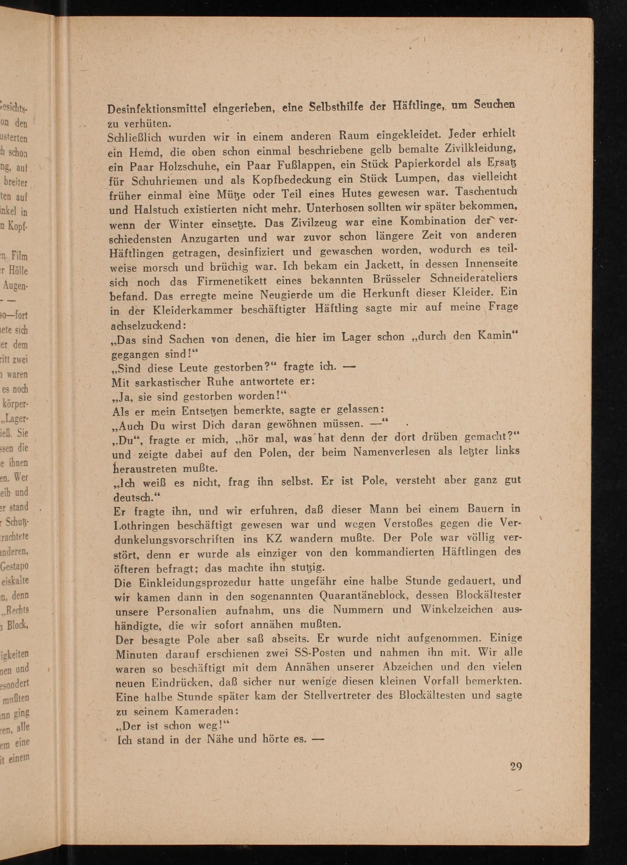 Schließlich wurden wir in einem anderen Raum eingekleidet. Jeder erhielt ein Hemd, die oben schon einmal beschriebene gelb bemalte Zivilkleidung, ein Paar Holzschuhe, ein Paar Fußlappen, ein Stück Papierkordel als Ersatz für Schuhriemen und als Kopfbedeckung ein Stück Lumpen, das vielleicht früher einmal eine Mütze oder Teil eines Hutes gewesen war. Taschentuch und Halstuch existierten nicht mehr. Unterhosen sollten wir später bekommen, wenn der Winter einsetzte. Das Zivilzeug war eine Kombination der verschiedensten Anzugarten und war zuvor schon längere Zeit von anderen Häftlingen getragen, desinfiziert und gewaschen worden, wodurch es teilweise morsch und brüchig war. Ich bekam ein Jackett, in dessen Innenseite sich noch das Firmenetikett eines bekannten Brüsseler Schneiderateliers befand. Das erregte meine Neugierde um die Herkunft dieser Kleider. Ein in der Kleiderkammer beschäftigter Häftling sagte mir auf meine Frage achselzuckend: