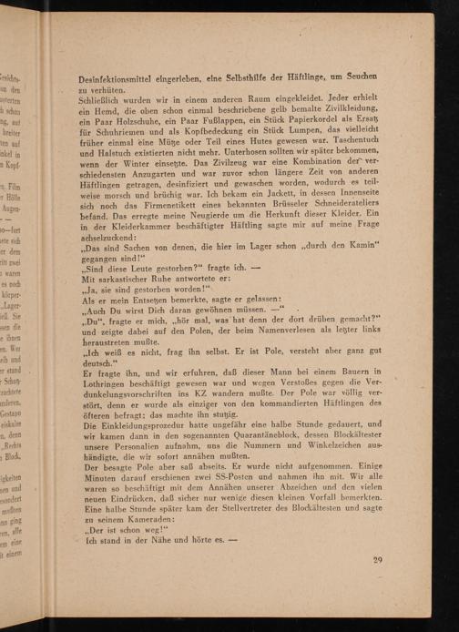 Er fragte ihn, und wir erfuhren, daß dieser Mann bei einem Bauern in Lothringen beschäftigt gewesen war und wegen Verstoßes gegen die Verdunkelungsvorschriften ins KZ wandern mußte. Der Pole war völlig verstört, denn er wurde als einziger von den kommandierten Häftlingen des öfteren befragt; das machte ihn stutzig.
