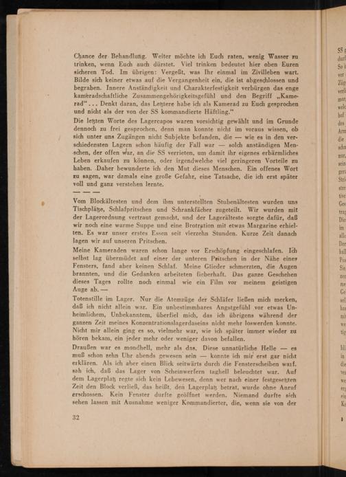 Die letzten Worte des Lagercapos waren vorsichtig gewählt und im Grunde dennoch zu frei gesprochen, denn man konnte nicht im voraus wissen, ob sich unter uns Zugängen nicht Subjekte befanden, die wie es in den verschiedensten Lagern schon häufig der Fall war solch anständigen Menschen, der offen war, an die SS verrieten, um damit ihr eigenes erbärmliches Leben erkaufen zu können, oder irgendwelche viel geringeren Vorteile zu haben. Daher bewunderte ich den Mut dieses Menschen. Ein offenes Wort zu sagen, war damals eine große Gefahr, eine Tatsache, die ich erst später voll und ganz verstehen lernte.