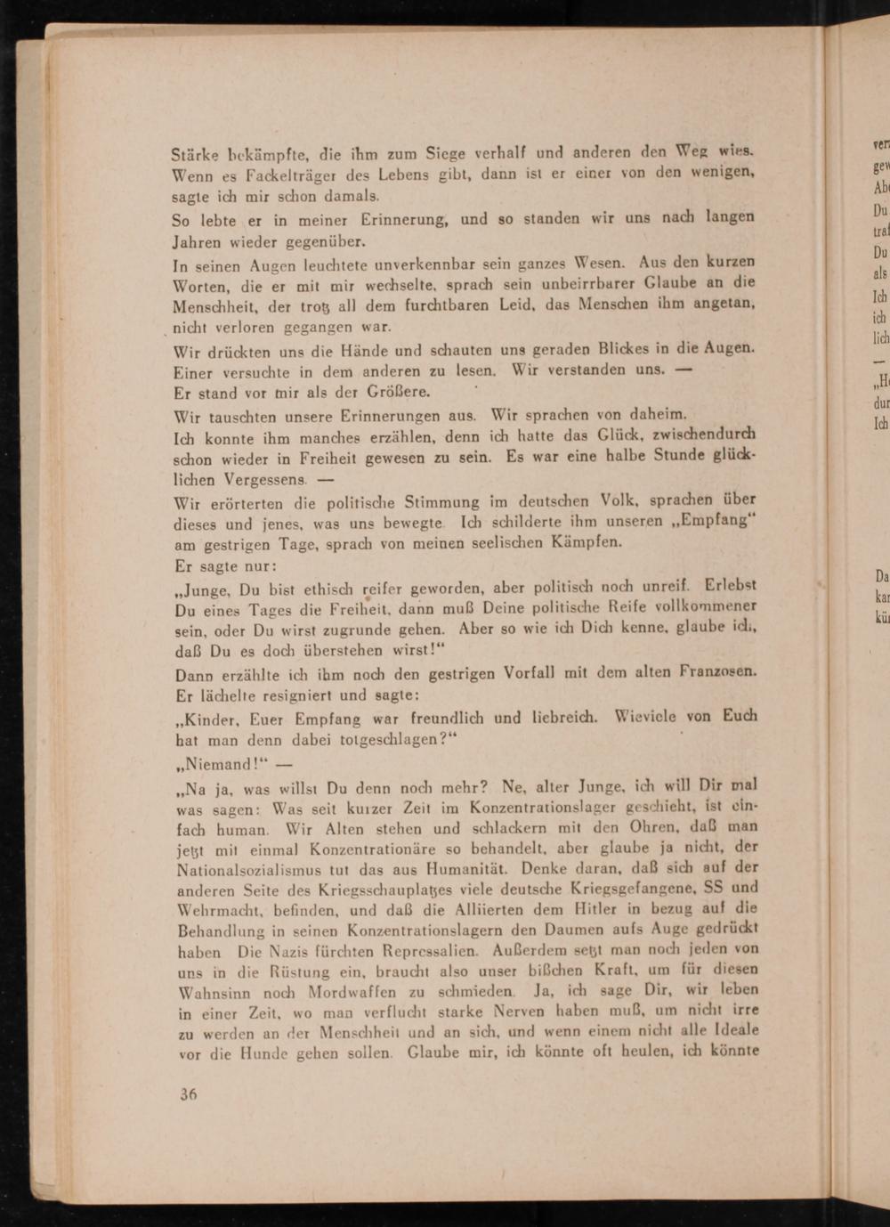 In seinen Augen leuchtete unverkennbar sein ganzes Wesen. Aus den kurzen Worten, die er mit mir wechselte, sprach sein unbeirrbarer Glaube an die Menschheit, der trotz all dem furchtbaren Leid, das Menschen ihm angetan, nicht verloren gegangen war.