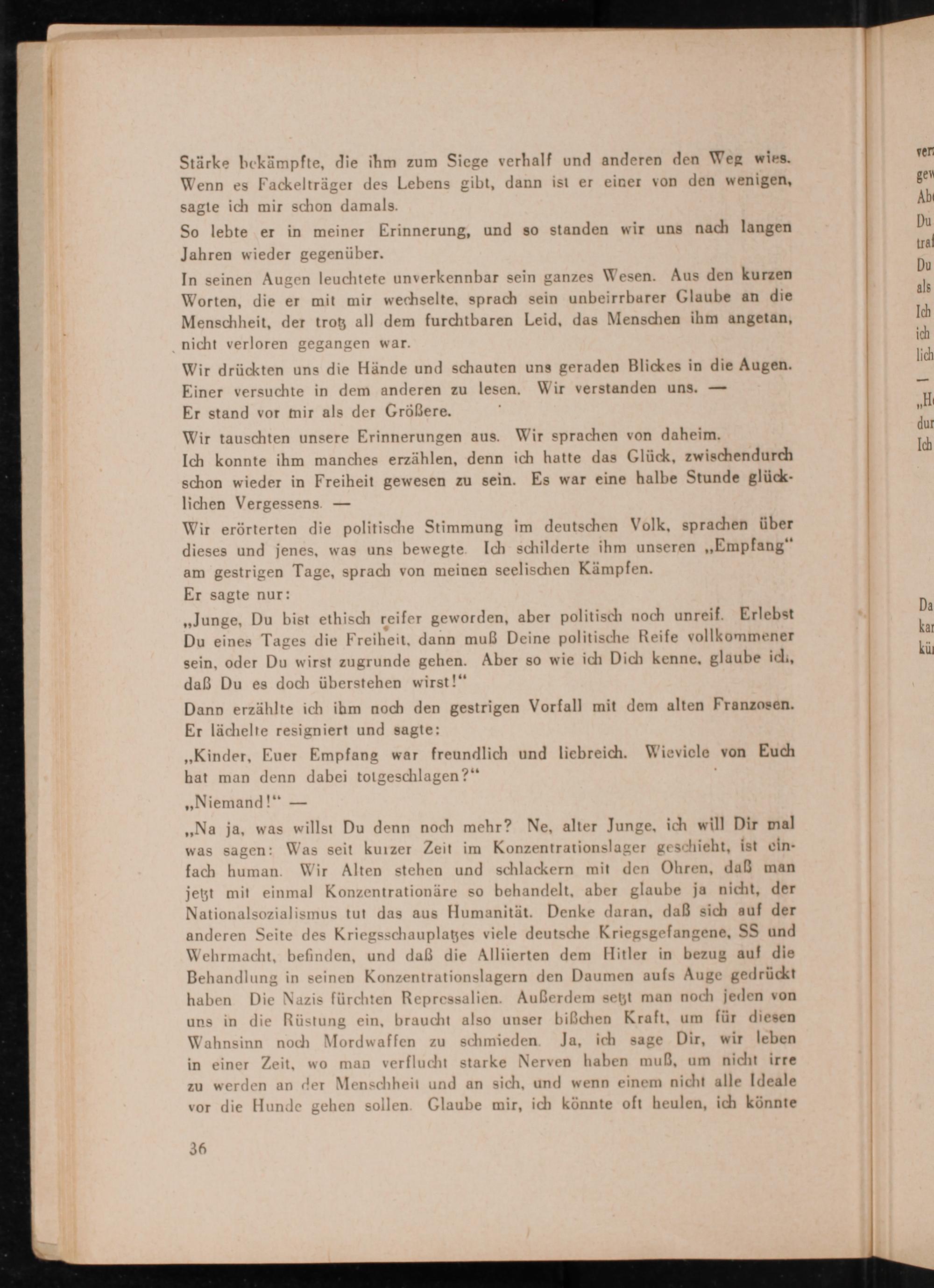 ,, Na ja, was willst Du denn noch mehr? Ne, alter Junge, ich will Dir mal was sagen: Was seit kurzer Zeit im Konzentrationslager geschieht, ist einfach human. Wir Alten stehen und schlackern mit den Ohren, daß man jetzt mit einmal Konzentrationäre so behandelt, aber glaube ja nicht, der Nationalsozialismus tut das aus Humanität. Denke daran, daß sich auf der anderen Seite des Kriegsschauplatzes viele deutsche Kriegsgefangene, SS und Wehrmacht , befinden, und daß die Alliierten dem Hitler in bezug auf die Behandlung in seinen Konzentrationslagern den Daumen aufs Auge gedrückt haben Die Nazis fürchten Repressalien. Außerdem setzt man noch jeden von uns in die Rüstung ein, braucht also unser bißchen Kraft, um für diesen Wahnsinn noch Mordwaffen zu schmieden. Ja, ich sage Dir, wir leben in einer Zeit, wo man verflucht starke Nerven haben muß, um nicht irre zu werden an der Menschheit und an sich, und wenn einem nicht alle Ideale vor die Hunde gehen sollen. Glaube mir, ich könnte oft heulen, ich könnte