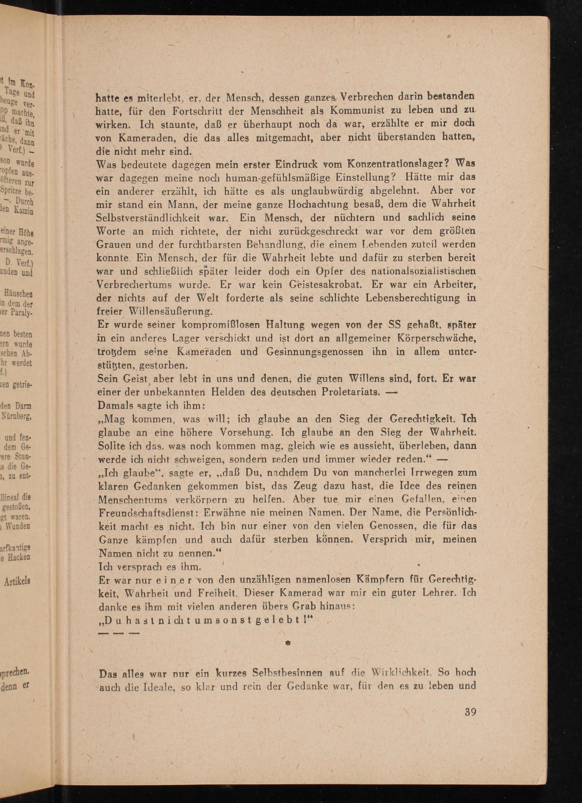 Was bedeutete dagegen mein erster Eindruck vom Konzentrationslager? Was war dagegen meine noch human- gefühlsmäßige Einstellung? Hätte mir das ein anderer erzählt, ich hätte es als unglaubwürdig abgelehnt. Aber vor mir stand ein Mann, der meine ganze Hochachtung besaß, dem die Wahrheit Selbstverständlichkeit war. Ein Mensch, der nüchtern und sachlich seine Worte an mich richtete, der nicht zurückgeschreckt war vor dem größten Grauen und der furchtbarsten Behandlung, die einem Lebenden zuteil werden konnte. Ein Mensch, der für die Wahrheit lebte und dafür zu sterben bereit war und schließlich später leider doch ein Opfer des nationalsozialistischen Verbrechertums wurde. Er war kein Geistesakrobat. Er war ein Arbeiter, der nichts auf der Welt forderte als seine schlichte Lebensberechtigung in freier Willensäußerung.