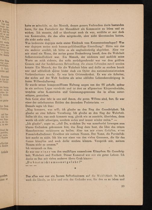 Sein Geist aber lebt in uns und denen, die guten Willens sind, fort. Er war einer der unbekannten Helden des deutschen Proletariats. Damals sagte ich ihm: