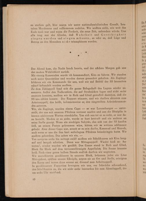 Wir, als Zugänge, wurden einem Capo er war Luxemburger stellt, der uns mit unseren Pflichten vertraut machte und uns die Disziplin in kurzen nüchternen Worten einschärfte. Von sich aus tat er es nicht, er war dazu bestellt. Machte er es nicht, wurde er hart bestraft und ein anderer an seine Stelle gesetzt. Wenn ein niedriges Subjekt, das sich von der SS kaufen lieẞ, an seinen Posten gekommen wäre, hätten wir es weitaus schlimmer gehabt. Aber dieser Capo war, soweit er es sein durfte, Kamerad und Mensch, auch wenn er uns die ihm hart auferlegten Pflichten beizubringen hatte. Wir mußten gehorchen. Das sahen wir ein.