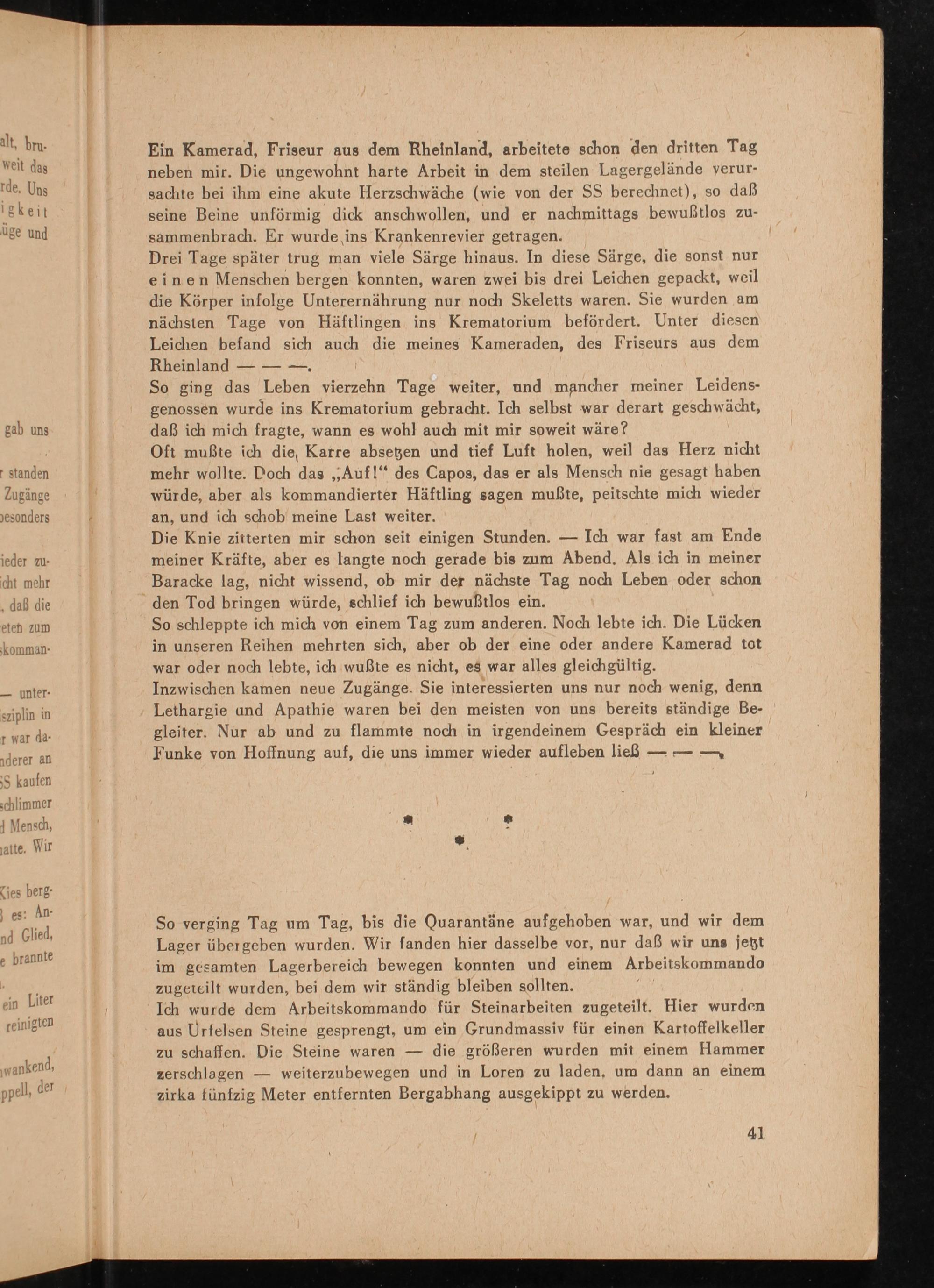 Oft mußte ich die, Karre absetzen und tief Luft holen, weil das Herz nicht mehr wollte. Doch das ,, Auf!" des Capos, das er als Mensch nie gesagt haben würde, aber als kommandierter Häftling sagen mußte, peitschte mich wieder an, und ich schob meine Last weiter.
