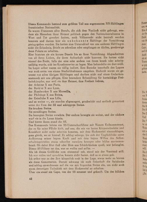 Es waren Franzosen aller Berufe, die sich dem Nazijoch nicht gebeugt, sondern als Menschen ihrer Heimat politisch gegen den Nationalsozialismus in Wort und Tat gewehrt hatten, nach Völkerrecht nicht bestraft werden konnten und darum hier als unbekannte Häftlinge der Vernichtung preisgegeben wurden. Sie hatten zum Unterschied von uns anderen Häftlingen nicht die Erlaubnis, Briefe zu schreiben oder empfangen zu dürfen, geschweige denn Pakete zu erhalten.