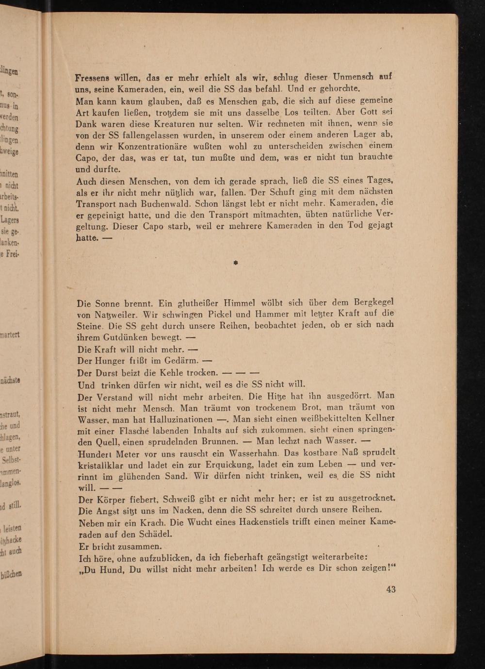 Der Verstand will nicht mehr arbeiten. Die Hitze hat ihn ausgedörrt. Man ist nicht mehr Mensch. Man träumt von trockenem Brot, man träumt von Wasser, man hat Halluzinationen Man sieht einen weißbekittelten Kellner mit einer Flasche labenden Inhalts auf sich zukommen, sieht einen springenden Quell, einen sprudelnden Brunnen. Man lechzt nach Wasser. Hundert Meter vor uns rauscht ein Wasserhahn. Das kostbare Naẞ sprudelt kristallklar und ladet ein zur Erquickung, ladet ein zum Leben und verrinnt im glühenden Sand. Wir dürfen nicht trinken, weil es die SS nicht will.