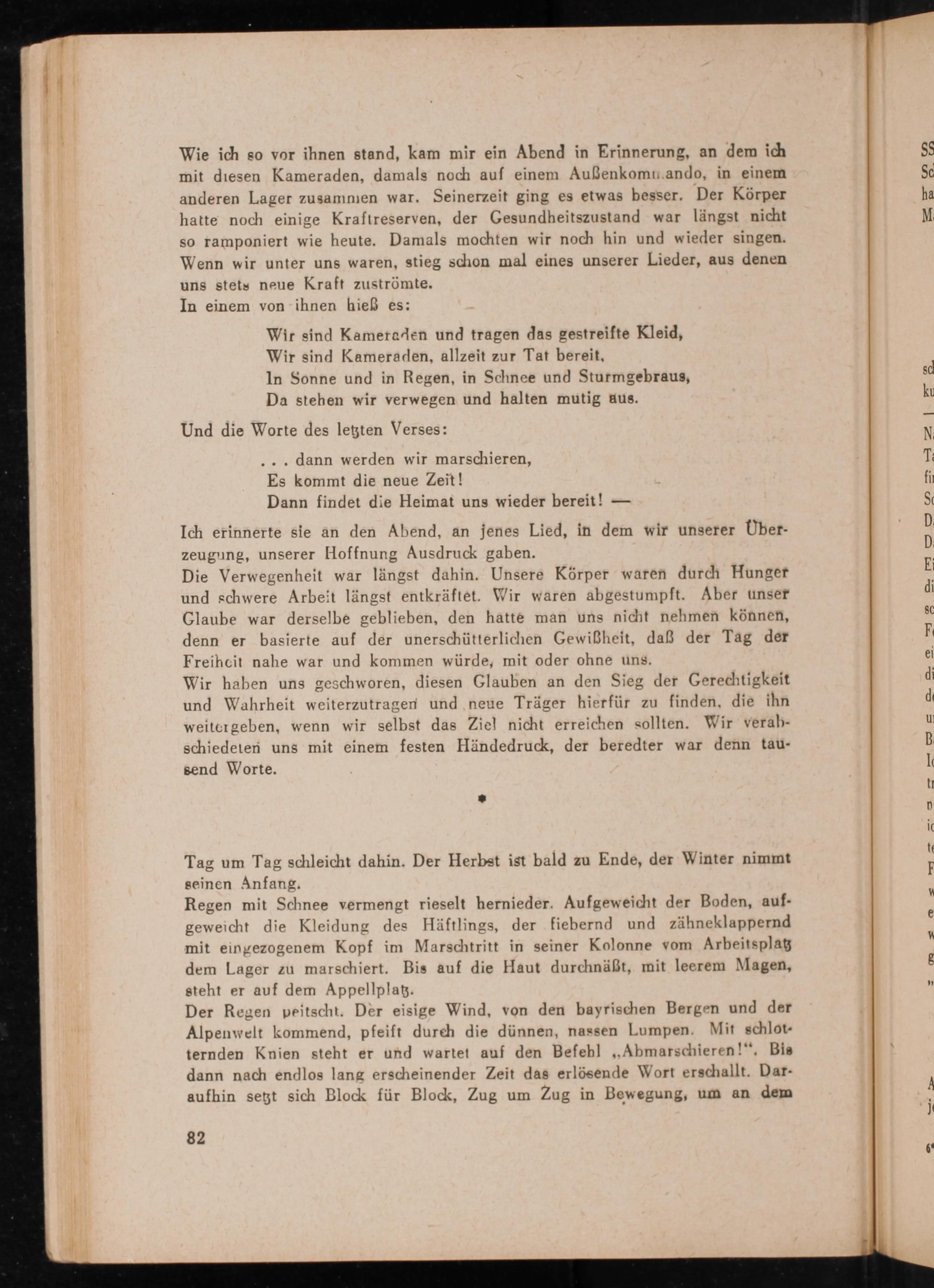 Wie ich so vor ihnen stand, kam mir ein Abend in Erinnerung, an dem ich mit dıesen Kameraden, damals noch auf einem Außenkomu.ando, in einem anderen Lager zusamnıen war. Seinerzeit ging es etwas besser. Der Körper hatte noch einige Kraftreserven, der Gesundheitszustand war längst nicht so ramponiert wie heute. Damals mochten wir noch hin und wieder singen. Wenn wir unter uns waren, stieg schon mal eines unserer Lieder, aus denen uns stets neue Kraft zuströmte,