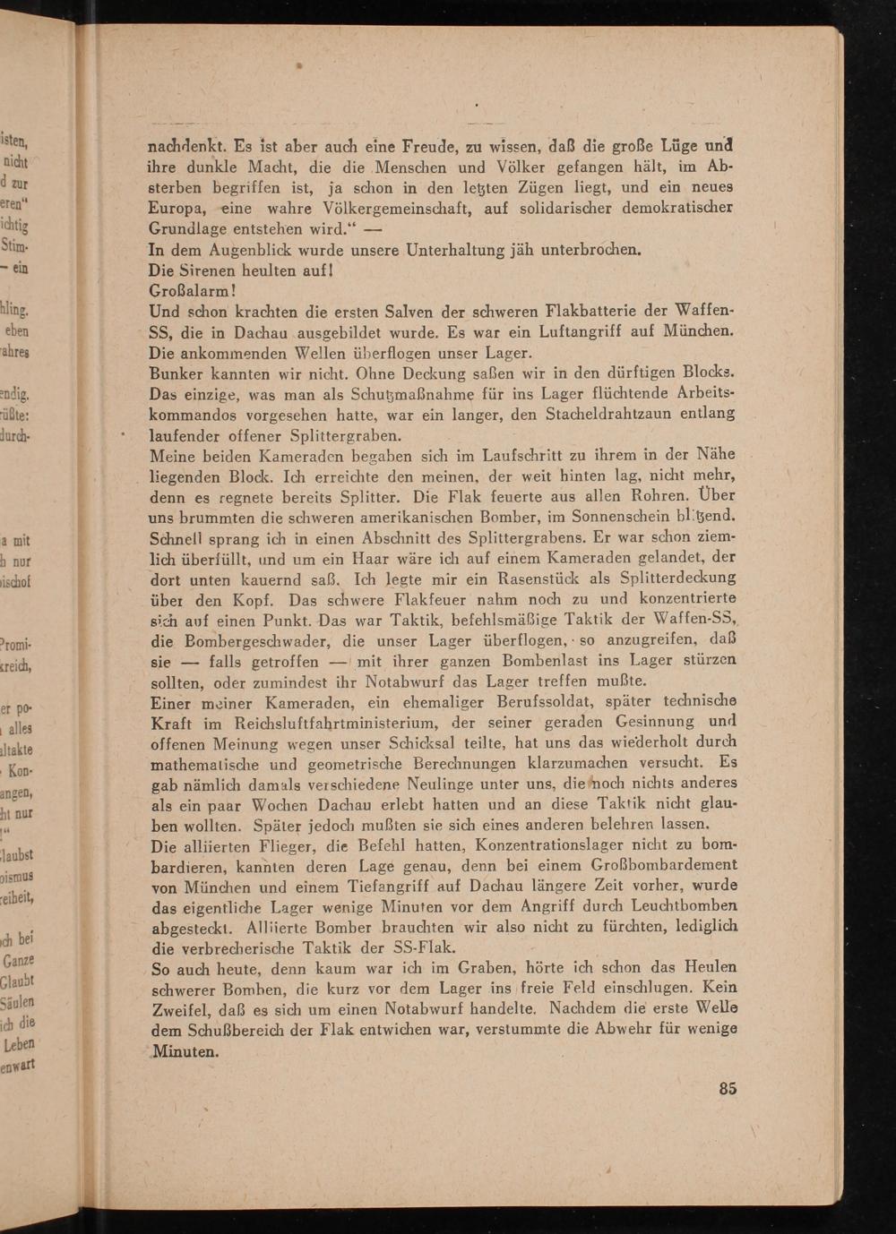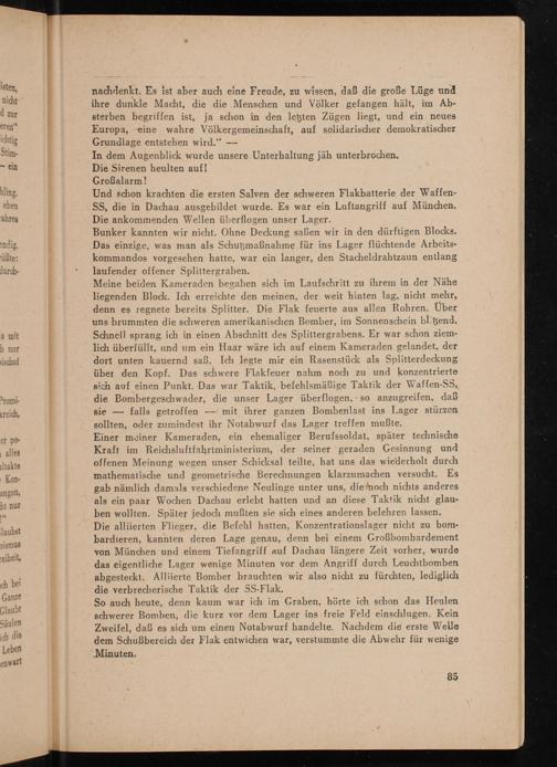 Meine beiden Kameraden begaben sich im Laufschritt zu ihrem in der Nähe liegenden Block. Ich erreichte den meinen, der weit hinten lag, nicht mehr, denn es regnete bereits Splitter. Die Flak feuerte aus allen Rohren. Über uns brummten die schweren amerikanischen Bomber, im Sonnenschein blitzend. Schnell sprang ich in einen Abschnitt des Splittergrabens. Er war schon ziemlich überfüllt, und um ein Haar wäre ich auf einem Kameraden gelandet, der dort unten kauernd saß. Ich legte mir ein Rasenstück als Splitterdeckung über den Kopf. Das schwere Flakfeuer nahm noch zu und konzentrierte sich auf einen Punkt. Das war Taktik, befehlsmäßige Taktik der Waffen- SS , die Bombergeschwader, die unser Lager überflogen, so anzugreifen, daß falls getroffen mit ihrer ganzen Bombenlast ins Lager stürzen sollten, oder zumindest ihr Notabwurf das Lager treffen mußte. Einer meiner Kameraden, ein ehemaliger Berufssoldat, später technische Kraft im Reichsluftfahrtministerium, der seiner geraden Gesinnung und offenen Meinung wegen unser Schicksal teilte, hat uns das wiederholt durch mathematische und geometrische Berechnungen klarzumachen versucht. Es gab nämlich damals verschiedene Neulinge unter uns, die noch nichts anderes als ein paar Wochen Dachau erlebt hatten und an diese Taktik nicht glauben wollten. Später jedoch mußten sie sich eines anderen belehren lassen. Die alliierten Flieger, die Befehl hatten, Konzentrationslager nicht zu bombardieren, kannten deren Lage genau, denn bei einem Großbombardement von München und einem Tiefangriff auf Dachau längere Zeit vorher, wurde das eigentliche Lager wenige Minuten vor dem Angriff durch Leuchtbomben abgesteckt. Alliierte Bomber brauchten wir also nicht zu fürchten, lediglich die verbrecherische Taktik der SS- Flak.