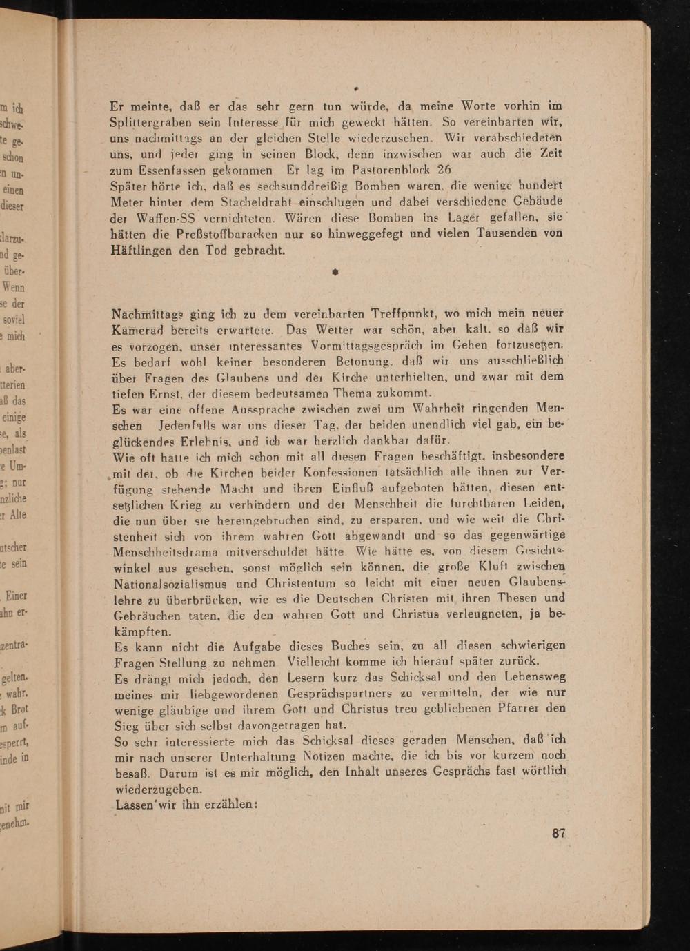 Er meinte, daß er das sehr gern tun würde, da meine Worte vorhin im Splittergraben sein Interesse für mich geweckt hätten. So vereinbarten wir, uns nachmittags an der gleichen Stelle wiederzusehen. Wir verabschiedeten uns, und jeder ging in seinen Block, denn inzwischen war auch die Zeit zum Essenfassen gekommen Er lag im Pastorenblock 26