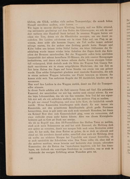Als ich im Begriff war, dem SS- Posten führer den fünften Toten zu melden, stieß mich mein Nebenmann an und bat mich flüsternd, die Meldung doch erst später zu erstatten, damit uns morgen früh noch seine Brotration sicher wäre. Er bat mich, ihm diese Ration zu geben, da er doch so schwach und elend sei. Ich erwiderte darauf nichts, unterließ aber auch die Meldung, denn ich wollte am nächsten Morgen bei Tageslicht erst einmal feststellen, ob er auch tatsächlich der Schwächste wäre. Den Toten rollte ich, ohne daß es die anderen merkten, etwas beiseite und bedeutete dem jungen, schwachen Kameraden, der die Ration des Verstorbenen begehrte, sich bei ihm hinzulegen, um dadurch ein vorzeitiges Entdecken zu vermeiden, was er auch in Anbetracht der ewaigen Erfüllung seines Wunsches gern tat.