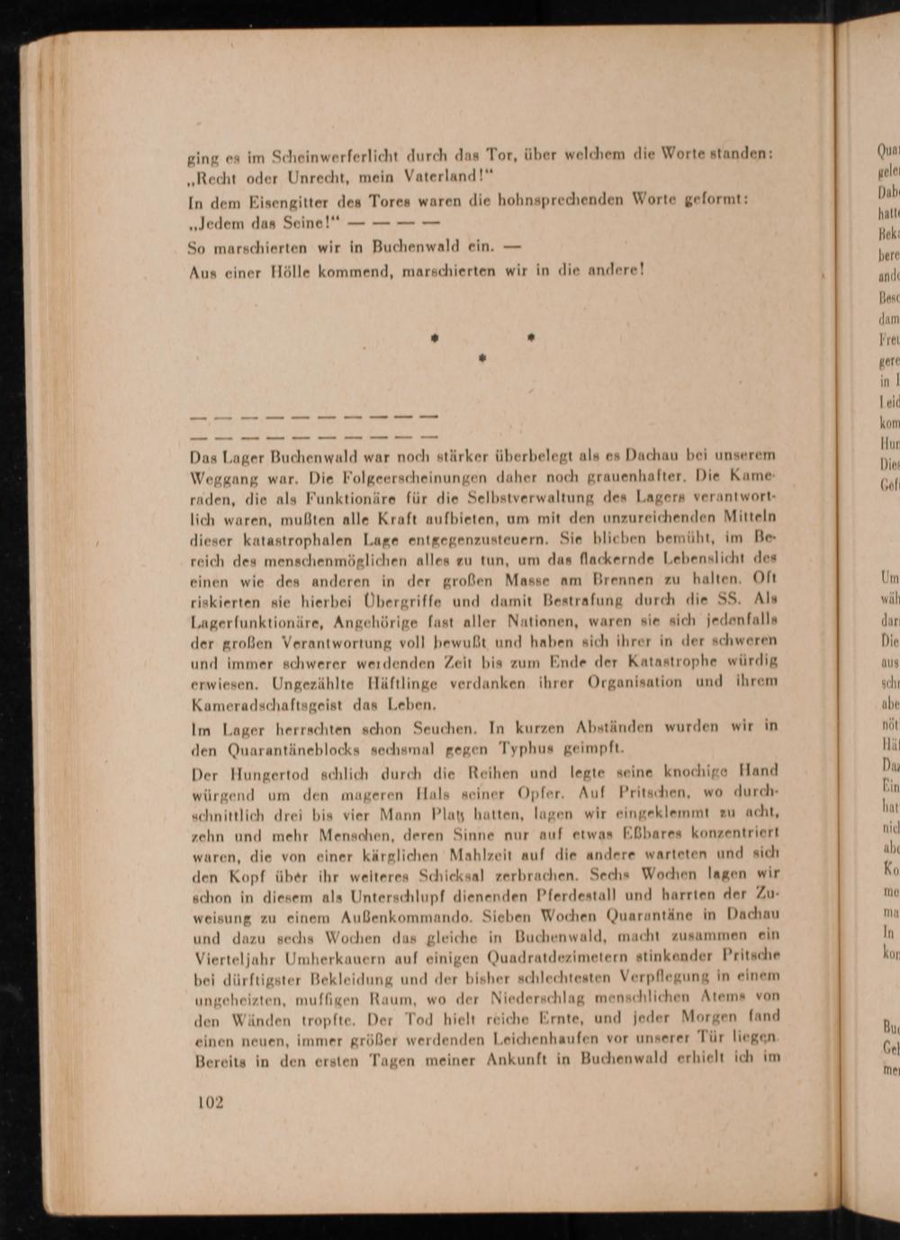 Der Hungertod schlich durch die Reihen und legte seine knochige Hand würgend um den mageren Hals seiner Opfer. Auf Pritschen, wo durchschnittlich drei bis vier Mann Plat hatten, lagen wir eingeklemmt zu acht, zehn und mehr Menschen, deren Sinne nur auf etwas Eßbares konzentriert waren, die von einer kärglichen Mahlzeit auf die andere warteten und sich den Kopf über ihr weiteres Schicksal zerbrachen. Sechs Wochen lagen wir schon in diesem als Unterschlupf dienenden Pferdestall und harrten der Zuweisung zu einem Außenkommando. Sieben Wochen Quarantäne in Dachau und dazu sechs Wochen das gleiche in Buchenwald , macht zusammen ein Vierteljahr Umherkauern auf einigen Quadratdezimetern stinkender Pritsche bei dürftigster Bekleidung und der bisher schlechtesten Verpflegung in einem ungeheizten, muffigen Raum, wo der Niederschlag menschlichen Atems von den Wänden tropfte. Der Tod hielt reiche Ernte, und jeder Morgen fand einen neuen, immer größer werdenden Leichenhaufen vor unserer Tür liegen. Bereits in den ersten Tagen meiner Ankunft in Buchenwald erhielt ich im