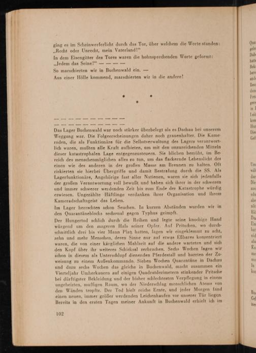 Das Lager Buchenwald war noch stärker überbelegt als es Dachau bei unserem Weggang war. Die Folgeerscheinungen daher noch grauenhafter. Die Kame raden, die als Funktionäre für die Selbstverwaltung des Lagers verantwortlich waren, mußten alle Kraft aufbieten, um mit den unzureichenden Mitteln dieser katastrophalen Lage entgegenzusteuern. Sie blicben bemüht, im Bereich des menschenmöglichen alles zu tun, um das flackernde Lebenslicht des einen wie des anderen in der großen Masse am Brennen zu halten. Oft riskierten sie hierbei Übergriffe und damit Bestrafung durch die SS. Als Lagerfunktionäre, Angehörige fast aller Nationen, waren sie sich jedenfalls der großen Verantwortung voll bewußt und haben sich ihrer in der schweren und immer schwerer werdenden Zeit bis zum Ende der Katastrophe würdig erwiesen. Ungezählte Häftlinge verdanken ihrer Organisation und ihrem Kameradschaftsgeist das Leben.
