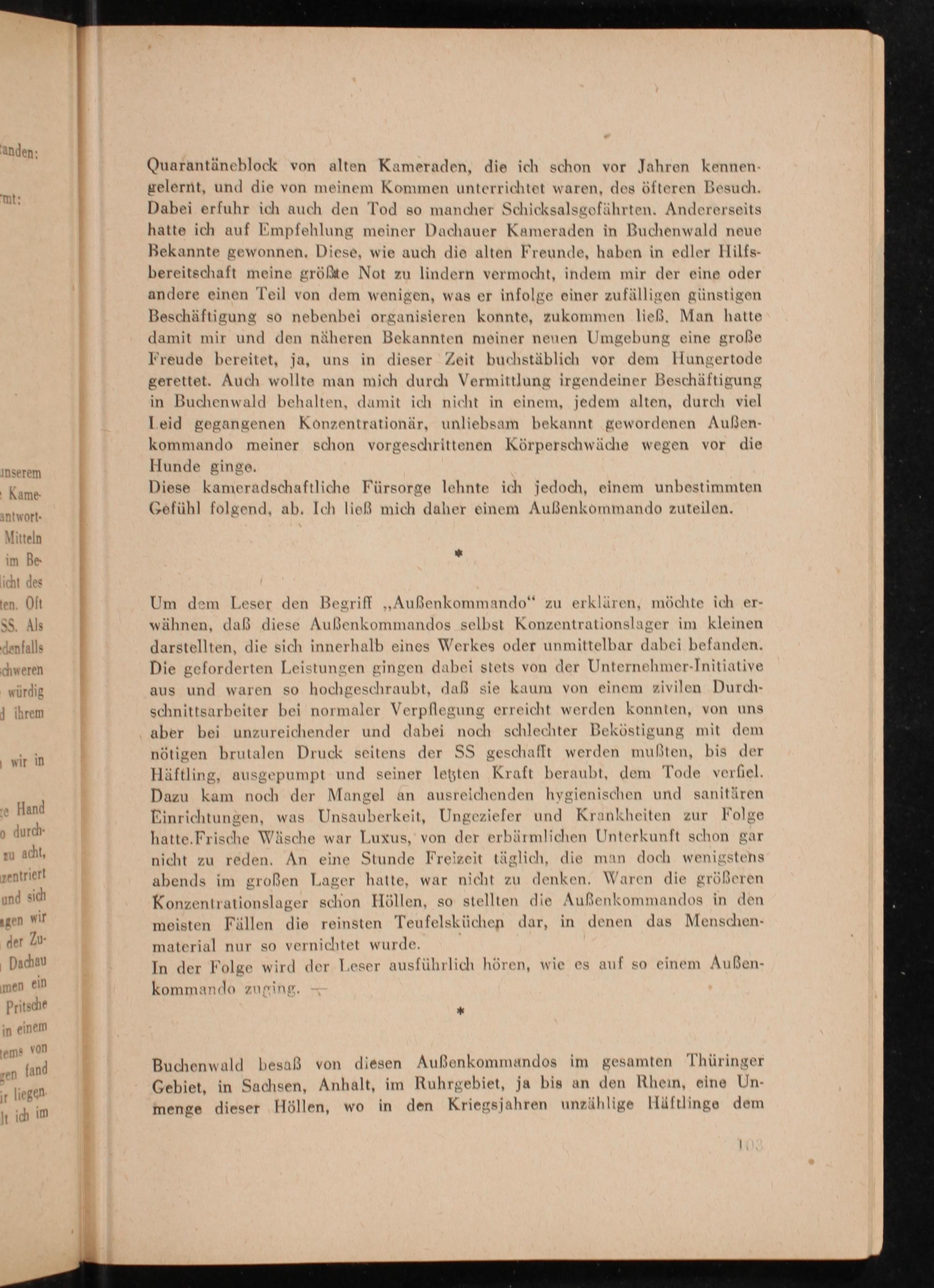 Buchenwald besaß von diesen Außenkommandos im gesamten Thüringer Gebiet, in Sachsen, Anhalt, im Ruhrgebiet , ja bis an den Rhein, eine Unmenge dieser Höllen, wo in den Kriegsjahren unzählige Häftlinge dem