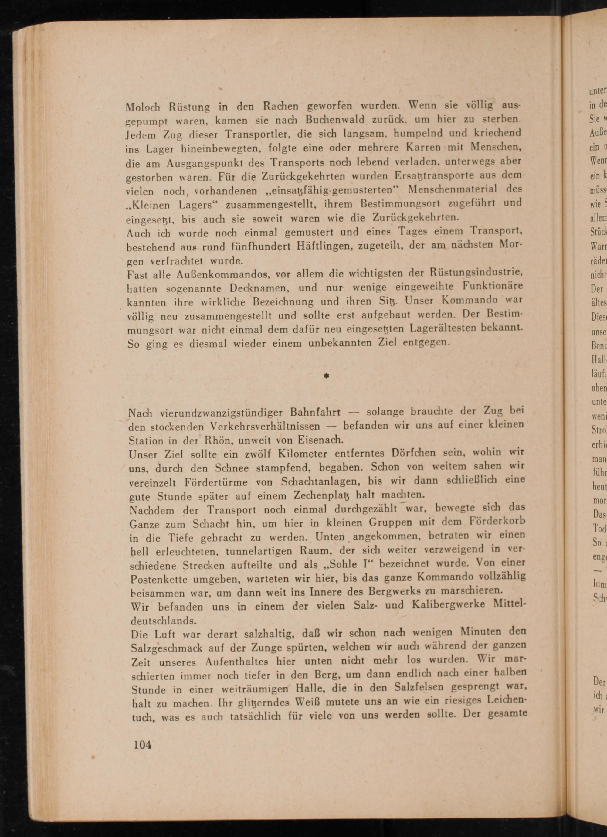 Nachdem der Transport noch einmal durchgezählt war, bewegte sich das Ganze zum Schacht hin, um hier in kleinen Gruppen mit dem Förderkorb in die Tiefe gebracht zu werden. Unten angekommen, betraten wir einen hell erleuchteten, tunnelartigen Raum, der sich weiter verzweigend in verschiedene Strecken aufteilte und als ,, Sohle I" bezeichnet wurde. Von einer Postenkette umgeben, warteten wir hier, bis das ganze Kommando vollzählig beisammen war, um dann weit ins Innere des Bergwerks zu marschieren. Wir befanden uns in einem der vielen Salz- und Kalibergwerke Mitteldeutschlands .