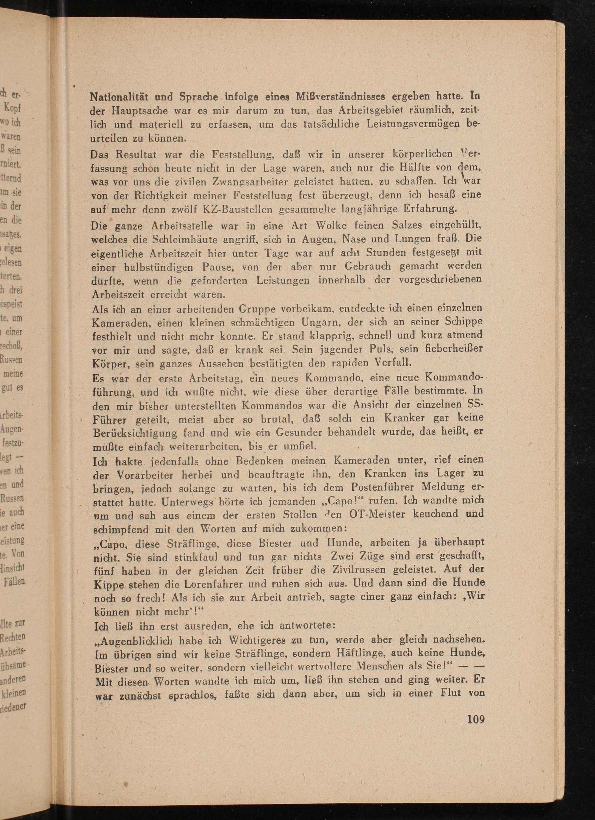 ,, Capo, diese Sträflinge, diese Biester und Hunde, arbeiten ja überhaupt nicht. Sie sind stinkfaul und tun gar nichts Zwei Züge sind erst geschafft, fünf haben in der gleichen Zeit früher die Zivilrussen geleistet. Auf der Kippe stehen die Lorenfahrer und ruhen sich aus. Und dann sind die Hunde noch so frech! Als ich sie zur Arbeit antrieb, sagte einer ganz einfach:, Wir können nicht mehr'!"
