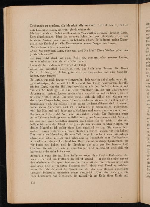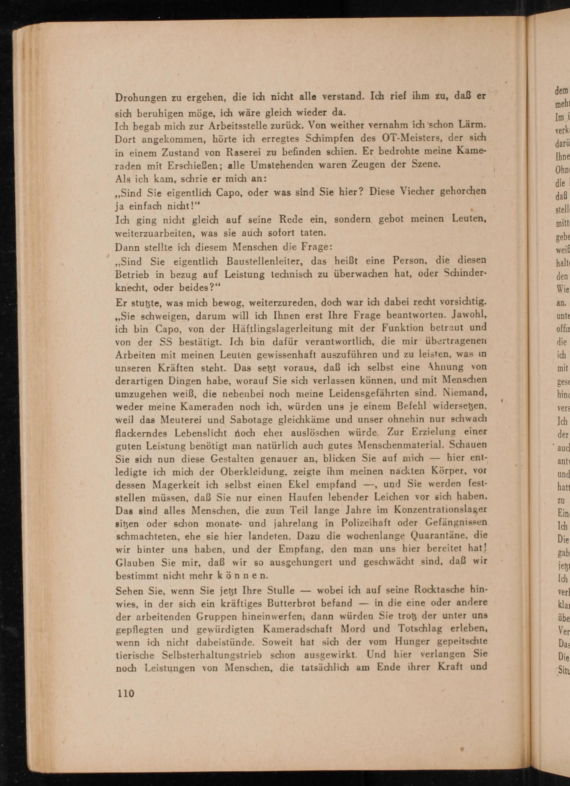 Sehen Sie, wenn Sie jetzt Ihre Stulle wobei ich auf seine Rocktasche hinwies, in der sich ein kräftiges Butterbrot befand in die eine oder andere der arbeitenden Gruppen hineinwerfen, dann würden Sie trotz der unter uns gepflegten und gewürdigten Kameradschaft Mord und Totschlag erleben, wenn ich nicht dabeistünde. Soweit hat sich der vom Hunger gepeitschte tierische Selbsterhaltungstrieb schon ausgewirkt. Und hier verlangen Sie noch Leistungen von Menschen, die tatsächlich am Ende ihrer Kraft und