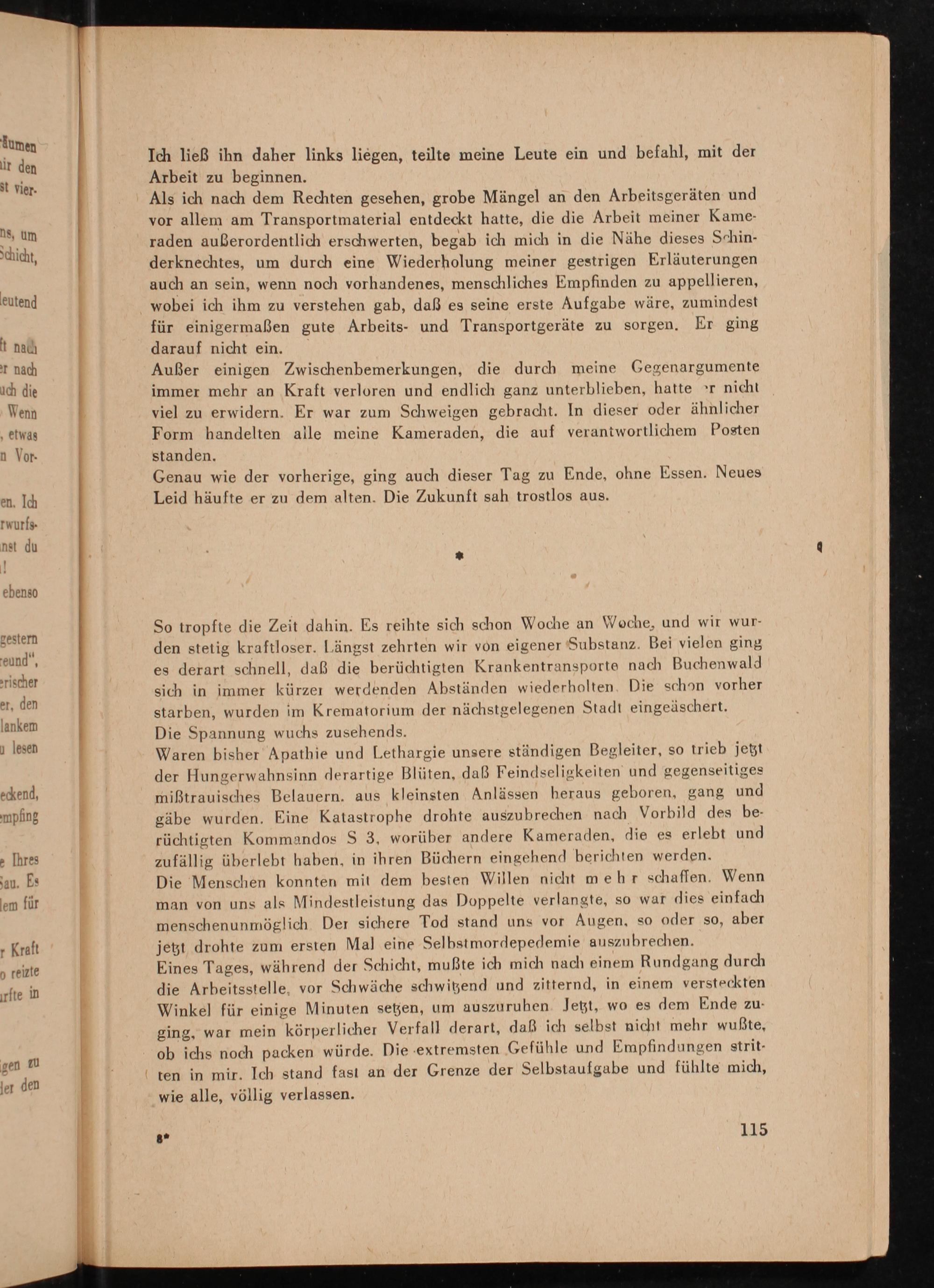 Waren bisher Apathie und Lethargie unsere ständigen Begleiter, so trieb jetzt der Hungerwahnsinn derartige Blüten, daß Feindseligkeiten und gegenseitiges miẞtrauisches Belauern. aus kleinsten Anlässen heraus geboren, gang und gäbe wurden. Eine Katastrophe drohte auszubrechen nach Vorbild des berüchtigten Kommandos S 3, worüber andere Kameraden, die es erlebt und zufällig überlebt haben, in ihren Büchern eingehend berichten werden. Die Menschen konnten mit dem besten Willen nicht mehr schaffen. Wenn man von uns als Mindestleistung das Doppelte verlangte, so war dies einfach menschenunmöglich. Der sichere Tod stand uns vor Augen, so oder so, aber jetzt drohte zum ersten Mal eine Selbstmordepedemie auszubrechen. Eines Tages, während der Schicht, mußte ich mich nach einem Rundgang durch die Arbeitsstelle, vor Schwäche schwitzend und zitternd, in einem versteckten Winkel für einige Minuten setzen, um auszuruhen. Jetzt, wo es dem Ende zuging, war mein körperlicher Verfall derart, daß ich selbst nicht mehr wußte, ob ichs noch packen würde. Die extremsten Gefühle und Empfindungen stritten in mir. Ich stand fast an der Grenze der Selbstaufgabe und fühlte mich, wie alle, völlig verlassen.