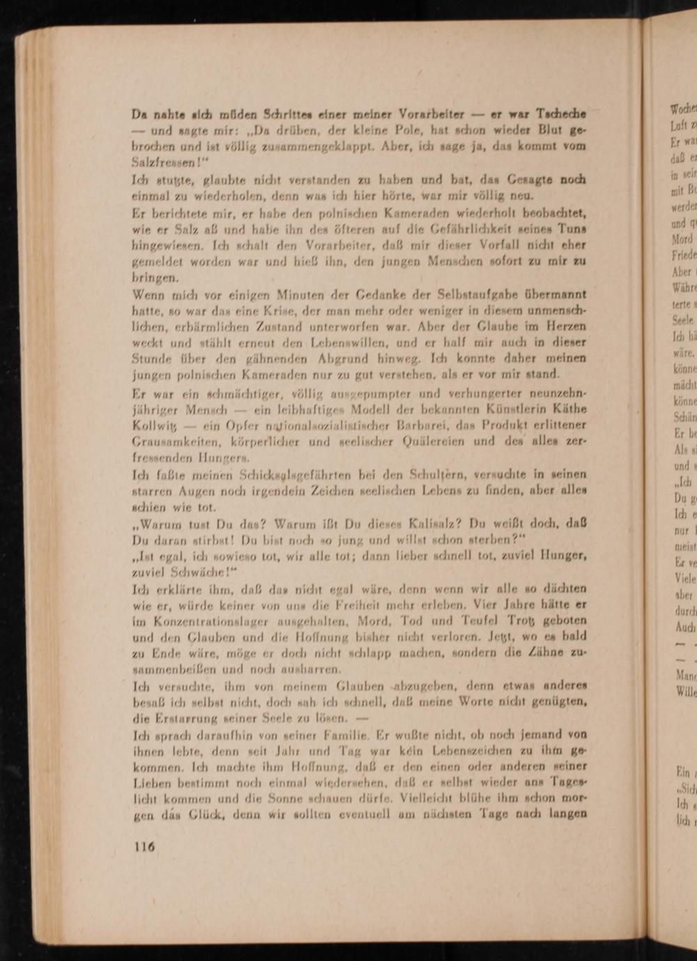 Wenn mich vor einigen Minuten der Gedanke der Selbstaufgabe übermannt hatte, so war das eine Krise, der man mehr oder weniger in diesem unmenschlichen, erbärmlichen Zustand unterworfen war. Aber der Glaube im Herzen weckt und stählt erneut den Lebenswillen, und er half mir auch in dieser Stunde über den gähnenden Abgrund hinweg. Ich konnte daher meinen jungen polnischen Kameraden nur zu gut verstehen, als er vor mir stand. Er war ein schmächtiger, völlig ausgepumpter und verhungerter neunzehnjähriger Mensch ein leibhaftiges Modell der bekannten Künstlerin Käthe Kollwit ein Opfer nationalsozialistischer Barbarei, das Produkt erlittener Grausamkeiten, körperlicher und seelischer Quälereien und des alles zerfressenden Hungers.