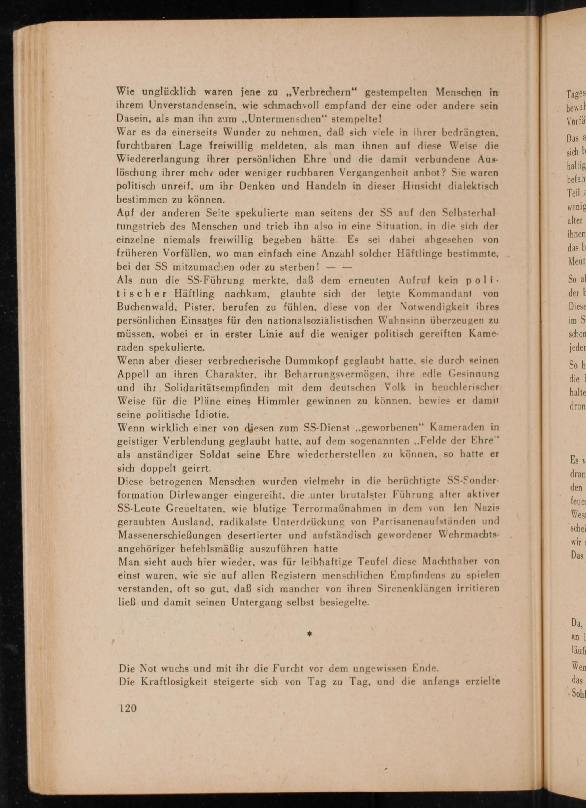 War es da einerseits Wunder zu nehmen, daß sich viele in ihrer bedrängten, furchtbaren Lage freiwillig meldeten, als man ihnen auf diese Weise die Wiedererlangung ihrer persönlichen Ehre und die damit verbundene Auslöschung ihrer mehr oder weniger ruchbaren Vergangenheit anbot? Sie waren politisch unreif, um ihr Denken und Handeln in dieser Hinsicht dialektisch bestimmen zu können.