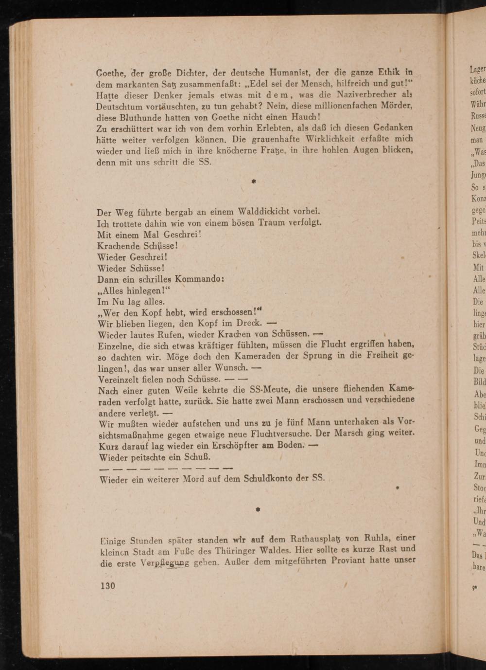 Wir mußten wieder aufstehen und uns zu je fünf Mann unterhaken als Vorsichtsmaßnahme gegen etwaige neue Fluchtversuche. Der Marsch ging weiter. Kurz darauf lag wieder ein Erschöpfter am Boden.- Wieder peitschte ein Schuß.