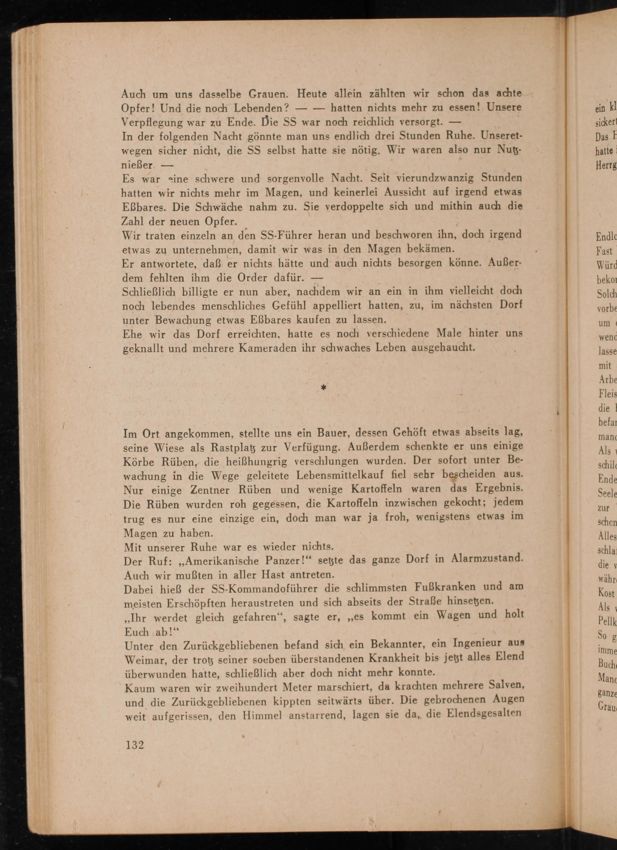 Auch um uns dasselbe Grauen. Heute allein zählten wir schon das achte Opfer! Und die noch Lebenden? hatten nichts mehr zu essen! Unsere Verpflegung war zu Ende. Die SS war noch reichlich versorgt.