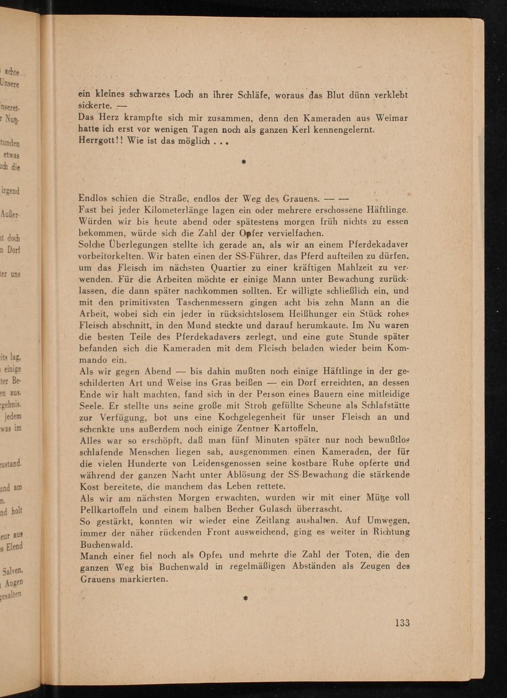 Fast bei jeder Kilometerlänge lagen ein oder mehrere erschossene Häftlinge. Würden wir bis heute abend oder spätestens morgen früh nichts zu essen bekommen, würde sich die Zahl der Opfer vervielfachen. Solche Überlegungen stellte ich gerade an, als wir an einem Pferdekadaver vorbeitorkelten. Wir baten einen der SS - Führer, das Pferd aufteilen zu dürfen, um das Fleisch im nächsten Quartier zu einer kräftigen Mahlzeit zu verwenden. Für die Arbeiten möchte er einige Mann unter Bewachung zurücklassen, die dann später nachkommen sollten. Er willigte schließlich ein, und mit den primitivsten Taschenmessern gingen acht bis zehn Mann an die Arbeit, wobei sich ein jeder in rücksichtslosem Heißhunger ein Stück rohes Fleisch abschnitt, in den Mund steckte und darauf herumkaute. Im Nu waren die besten Teile des Pferdekadavers zerlegt, und eine gute Stunde später befanden sich die Kameraden mit dem Fleisch beladen wieder beim Kommando ein.