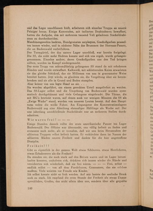 Einige Stunden danach rollte der erste amerikanische Panzer ins Lager Buchenwald . Der Offizier war überrascht, uns völlig befreit zu finden und erstaunte noch mehr, als er vernahm, daß wir uns beim Herannahen der alliierten Truppen selbst befreit hatten. Er verkündete dann im Namen der alliierten Mächte unsere Freiheit und dankte für die hier angetroflene Disziplin.