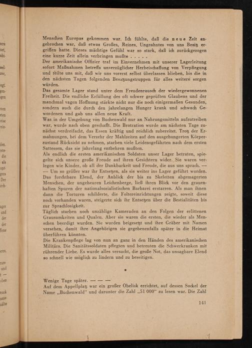 Was in der Umgebung von Buchenwald nur an Nahrungsmitteln aufzutreiben war, wurde nach oben geschafft. Die Brotration wurde am nächsten Tage zunächst verdreifacht, das Essen kräftig und reichlich zubereitet. Trotz der Ermahnungen, bei dem Verzehr der Mahlzeiten auf den ausgehungerten Körperzustand Rücksicht zu nehmen, starben viele Leidensgefährten nach dem ersten Sattessen, das sie jahrelang entbehren mußten.