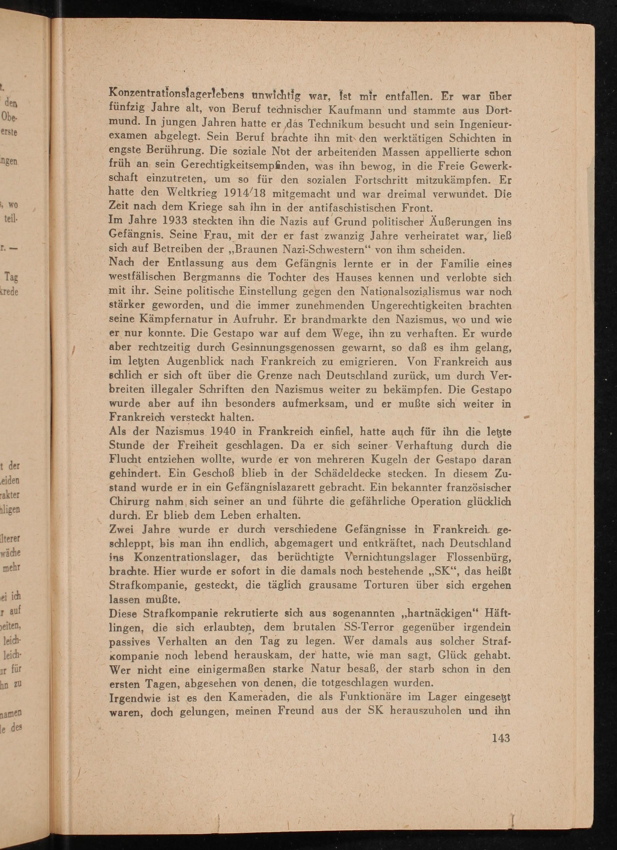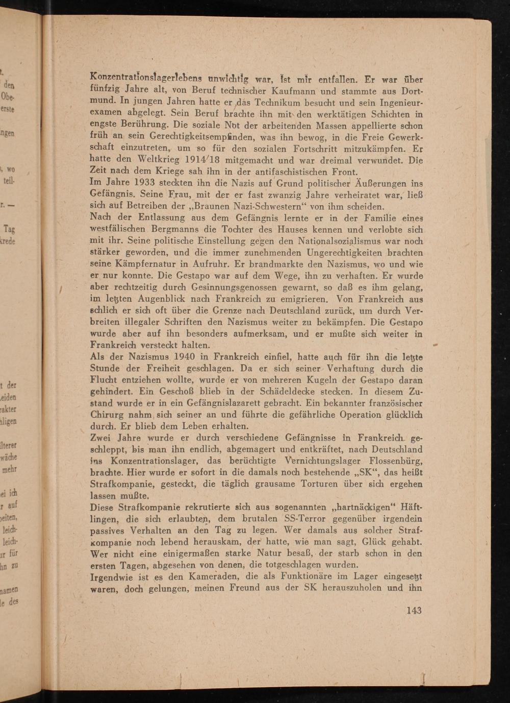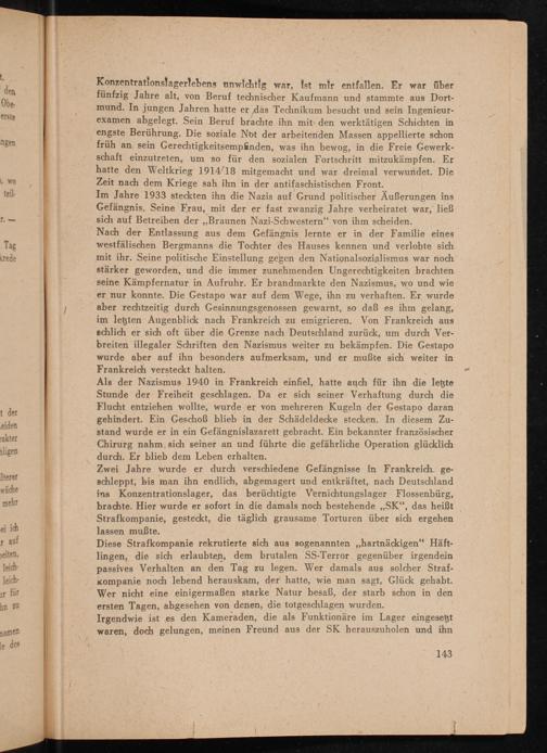 Konzentrationslagerlebens unwichtig war, ist mir entfallen. Er war über fünfzig Jahre alt, von Beruf technischer Kaufmann und stammte aus Dortmund . In jungen Jahren hatte er dás Technikum besucht und sein Ingenieurexamen abgelegt. Sein Beruf brachte ihn mit den werktätigen Schichten in engste Berührung. Die soziale Not der arbeitenden Massen appellierte schon früh an sein Gerechtigkeitsempfinden, was ihn bewog, in die Freie Gewerkschaft einzutreten, um so für den sozialen Fortschritt mitzukämpfen. Er hatte den Weltkrieg 1914/18 mitgemacht und war dreimal verwundet. Die Zeit nach dem Kriege sah ihn in der antifaschistischen Front.